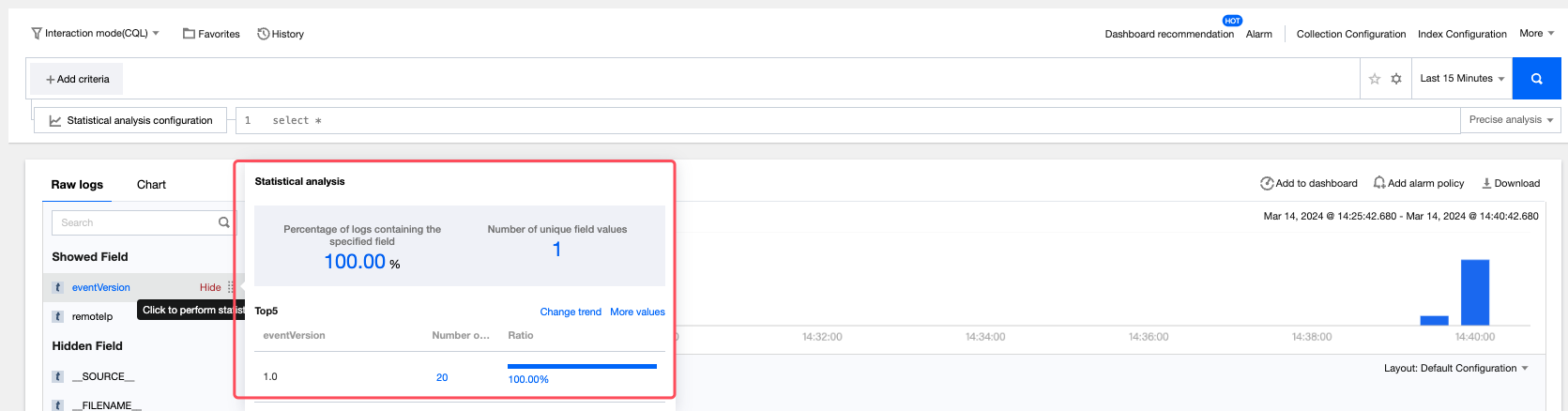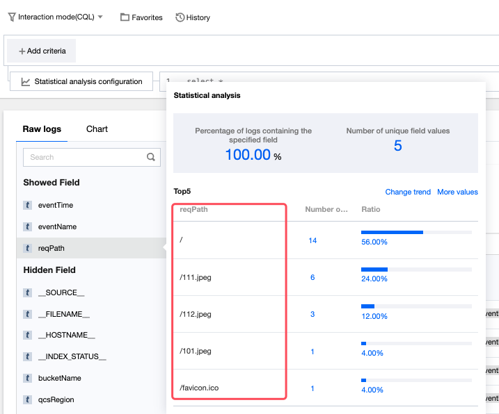 ログ検索は、クエリステートメントを入力することなく、フィールドにより高速な統計分析をサポートします。デフォルトでサポートされているフィールドについてはログフィールドの説明を参照し、詳細についてはクイック分析を参照してください。 注意: