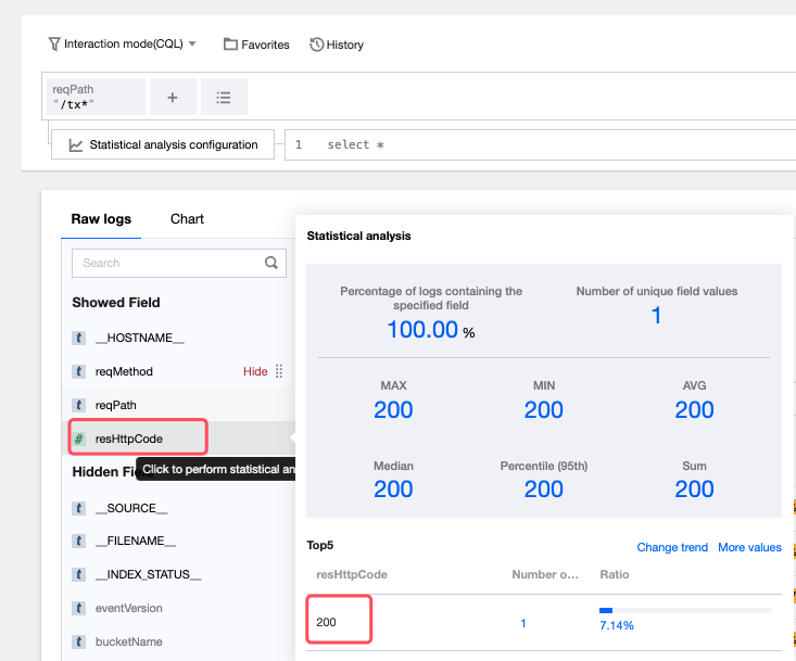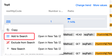 2. 左側のフィールド名をクリックすると、クイック分析が開き、 resHttpCode フィールドにより統計分析を行います。403ステータスコード、204ステータスコードなどの異常ステータスコードのログメッセージを表示します。