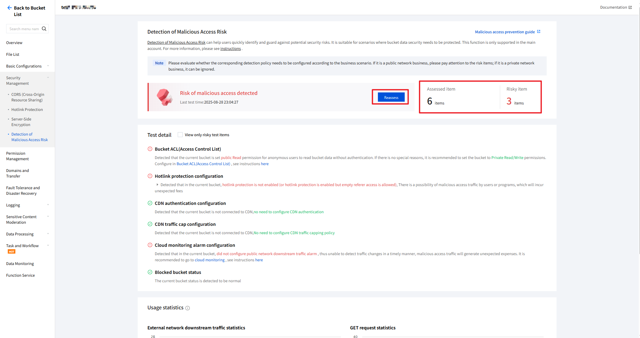 Cloud Object Storage (COS) はバケット盗用リスク検出をサポートしており、素早く設定することができます。この機能には、リスク検出と概要、検出詳細、使用統計の 3 つのモジュールが含まれています。盗用に関する防止対策の詳細については、 盗用防止ガイドを参照してください。 注意: