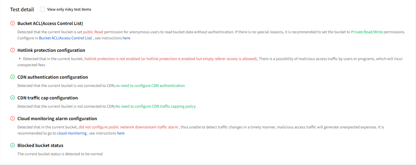 盗用リスクの検出には、 バケットのアクセス権、防犯リンク設定、CDN 認証設定、CDN トラフィック上限設定、Cloud Monitor アラーム設定、バケットのブロック状態 の 6 項目が含まれています。