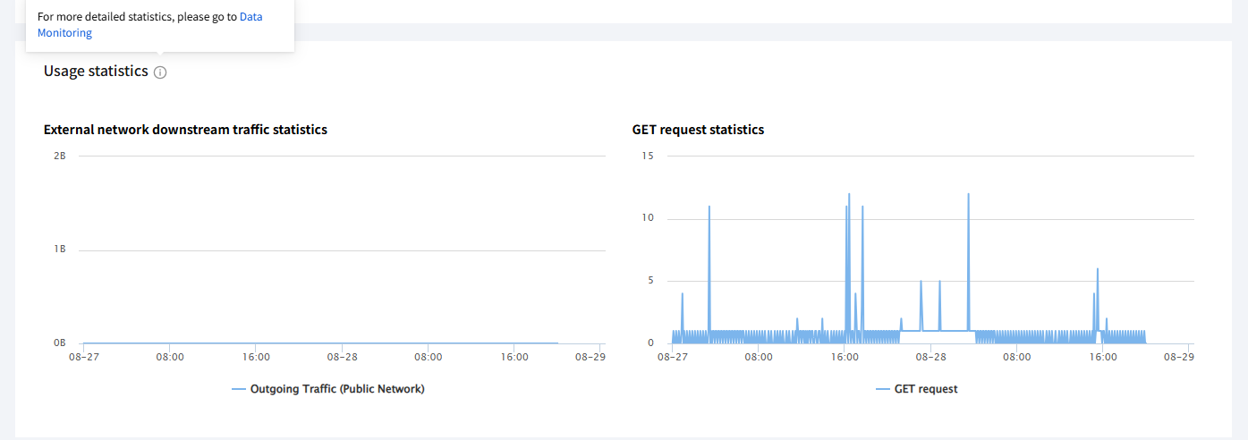使用統計モジュールでは、現在のバケットの過去 2 日間のパブリックネットワークにおける下りトラフィックと GET リクエスト統計を表示することができます。詳細なデータを表示するには、 データモニタリングをクリックするか、バケット構成ページからデータモニタリングに進んでください。