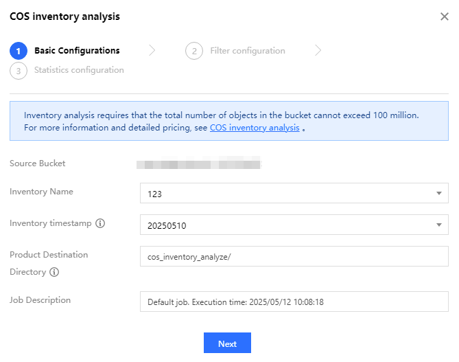 5. インベントリ解析の設定項目で、COSインベントリ解析関数を追加していない場合は、下の今すぐ使用をクリックしてください。その場合、システムはCOSインベントリ解析関数ルールを追加済みかどうかを検出します。COSイベントリ解析関数の追加を参照して関数を追加してください。 COSインベントリ解析関数を追加済みの場合、インベントリ解析エリアで対応する関数名を選択し、解析するインベントリの時間範囲を選択し、解析タスクを作成をクリックしてください。ポップアップウィンドウで下記の情報を設定できます。