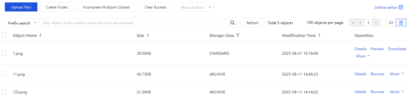 COSコンソールのバケット詳細に進み、バケットのファイルリストでファイルやフォルダの関連操作を行うことができます。ファイルリストで、ファイルのアップロード、フォルダの作成、ファイルフラグメントを管理、バケットの掃除、履歴バージョンのリストアップ、リストの検索またはリフレッシュ、フォルダ権限の設定、ファイル詳細の表示、プレビュー、ダウンロードなどの操作を行うことができます。