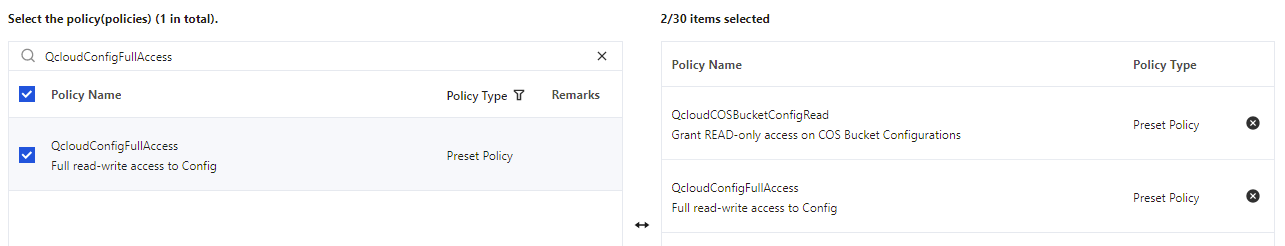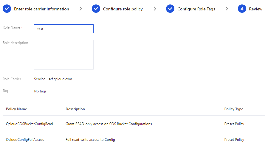1. CAMコンソールにログインし、ロール > ロールの新規作成 > Tencent Cloud製品サービスをクリックします。カスタムロールの新規作成ページで、製品サービスを検索してServerless Cloud Function(SCF)を選択し、次へをクリックします。 2. ポリシーリストでQcloudCOSBucketConfigReadポリシーおよびQcloudConfigFullAccessポリシーを検索してチェックを入れます。完了したら次へをクリックします。