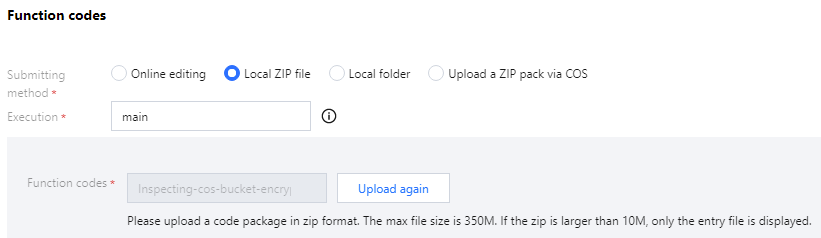 提出方法:ローカルzipファイルをアップロードを選択し、事前準備でダウンロードしたzipファイルをアップロードします。
