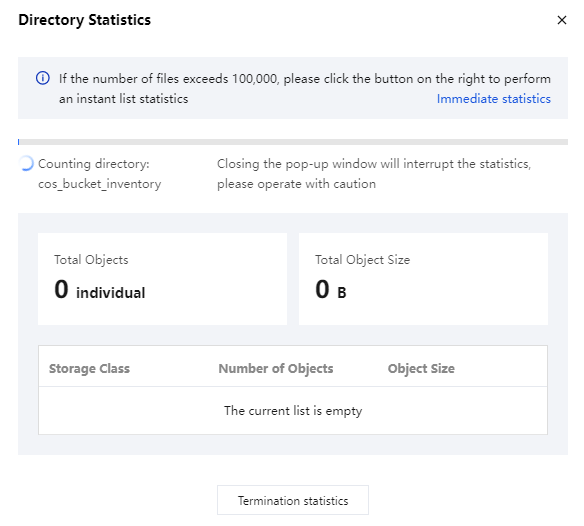 1. 統計ポップアップウィンドウで確認:統計完了後、統計結果(オブジェクト総数とオブジェクトの合計サイズ)をポップアップウィンドウで直接確認またはダウンロード可能です。