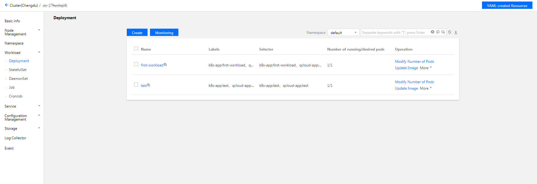 1. Tencent Kubernetes Engine(TKE)コンソールにログインして、左側ナビゲーションバーの【Clusters 】を選択してください。 2. Deploymentの作成を必要とするクラスターIDをクリックして、Deploymentが作成されるクラスター管理ページへ進みます。