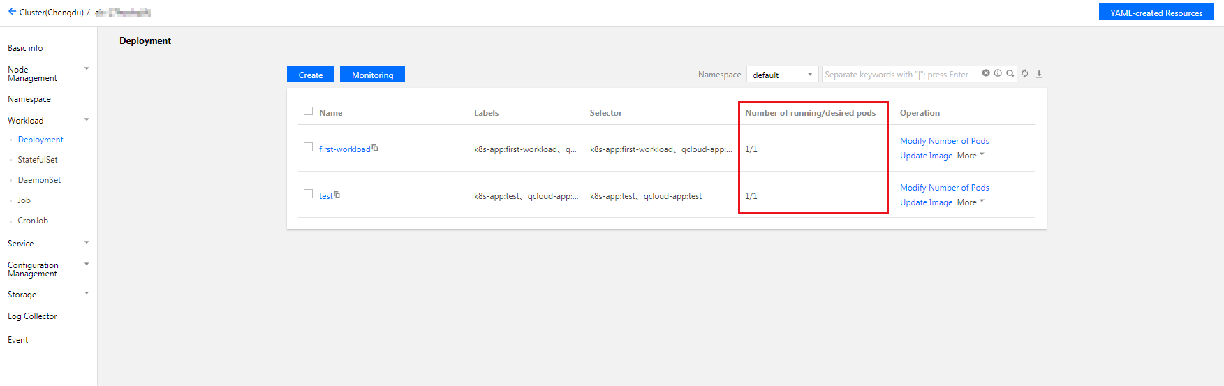 1. クラスター管理ページでは、Pod構成の更新を必要とするDeploymentのクラスターIDをクリックして、Pod構成が更新されるDeploymentのクラスター管理ページへ進みます。