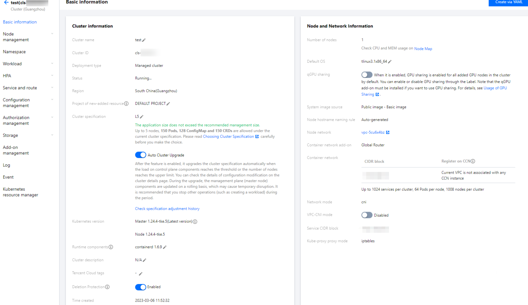 作成が完了したクラスターはクラスターリストに表示されます。クラスターIDをクリックしてクラスター詳細ページに進むことができます。クラスターの基本情報ページで、クラスター情報、ノードおよびネットワーク情報、クラスターAPIServer情報などを確認することができます。下図に示すとおりです。 ステップ6:クラスターの削除