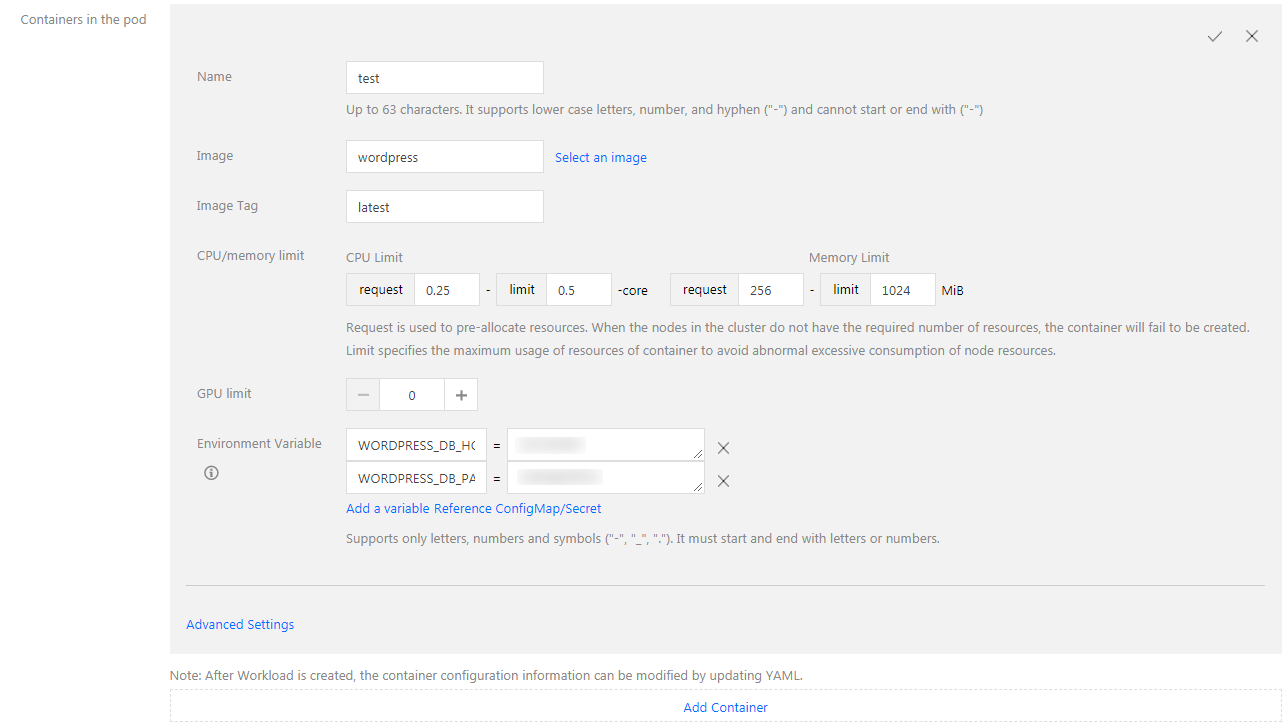 ボリューム:必要に応じてロードのマウントを設定します。詳細はVolume管理をご参照ください。 4. 次の情報を参照して「インスタンスコンテナ」を設定します。次の通りです。
