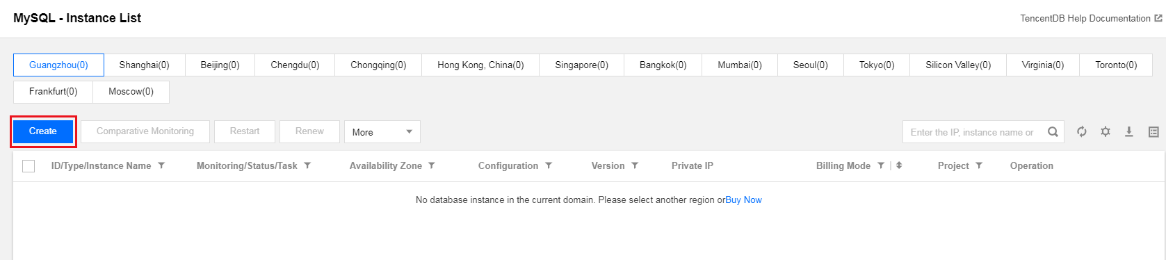 1. MySQLコンソールにログインし、DBインスタンスリストの上で【 Create 】をクリックします。下図の通りです: