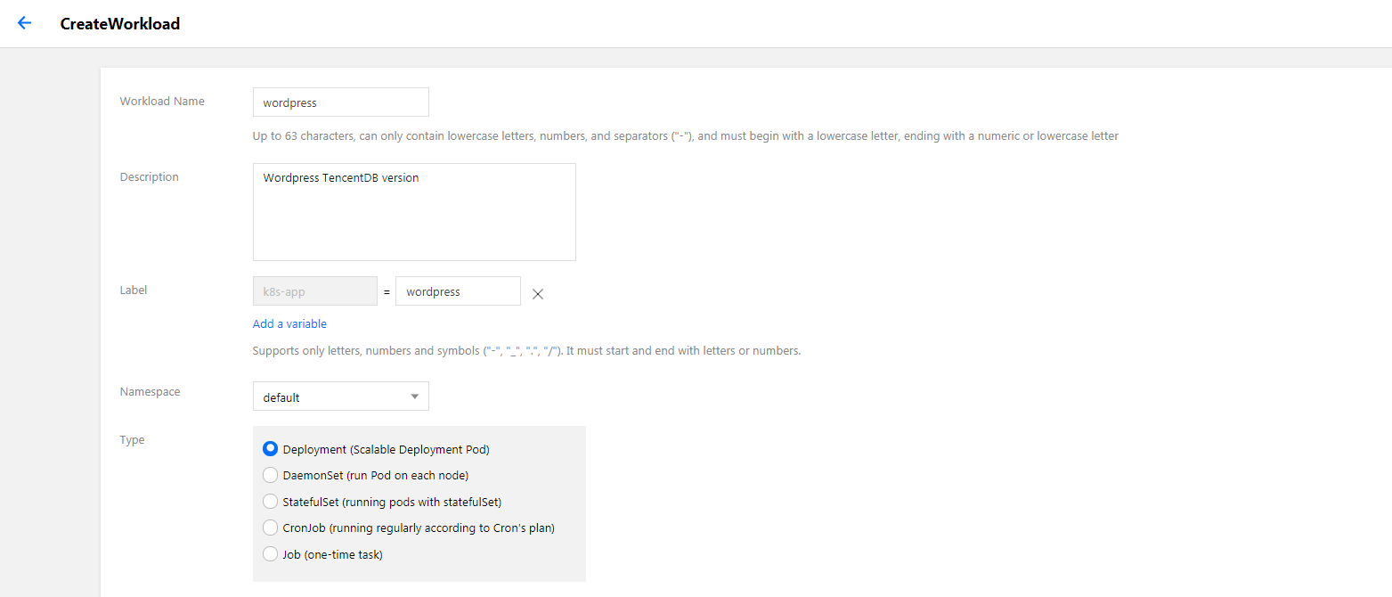 サービスのあるクラスターのセキュリティグループはノードネットワークとコンテナネットワークをインターネットにオープンしてください。同時に、30000 - 32768ポートをインターネットにオープンする必要もありますが、そうでなければTencent Kubernetes Engineが使用できない問題が発生する場合があります。詳細はTencent Kubernetes Engineセキュリティグループ設定をご参照ください。 7. 【Create workload】をクリックして、WordPressサービスの作成を完了します。