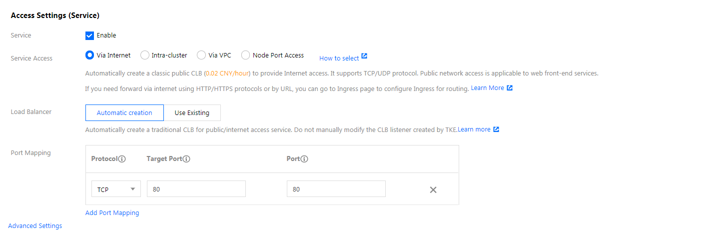 ポートマッピング:TCPプロトコルを選択し、コンテナポートとサービスポートを80に設定します。