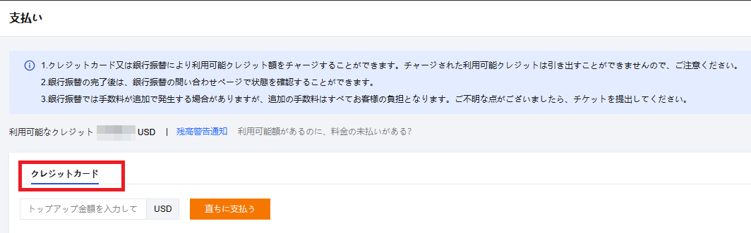 アカウントの利用可能残高がマイナスである場合、Tencent Cloudのポストペイサービスを購入するためにアカウントチャージを行う必要があります。未払いによるサービス中断を避けるために、残高を常にプラスに保つことをお勧めします。注意点として、Tencent Cloudのほとんどのサービスは時間単位課金です。したがって、未払いがあるとサービスが一時停止される可能性があります。チャージを行うために、オンライン支払いまた銀行振込を選択できます。