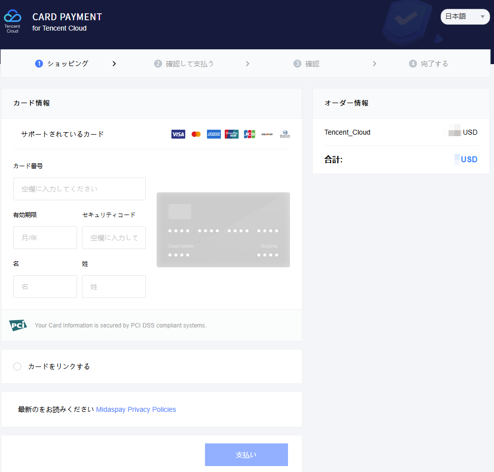 1. Tencent Cloud公式サイトにログインし、コストセンター > 資金管理 > 支払いに進み、クレジットカードをクリックしてチャージ金額を入力し、今すぐ支払うをクリックすると支払いページに遷移します。 2. 支払いページでは、既にバインドされたカードまたは新規追加の支払いアカウントを選択してチャージを行うことがサポートされています。
