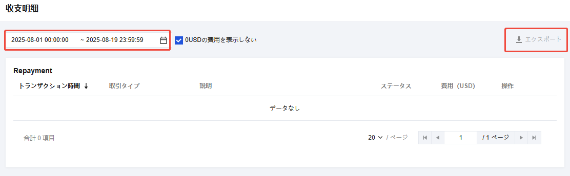 収支明細はアカウントのすべてのチャージを記録します。支出については、請求書表示に移動して詳細を確認してください。