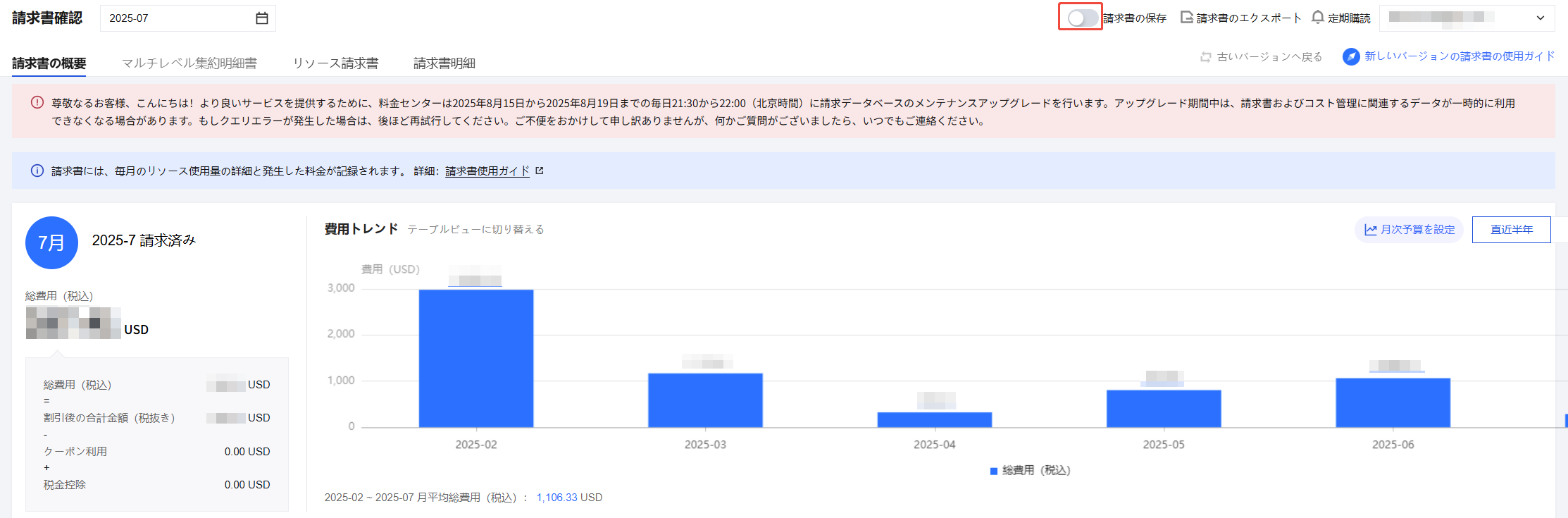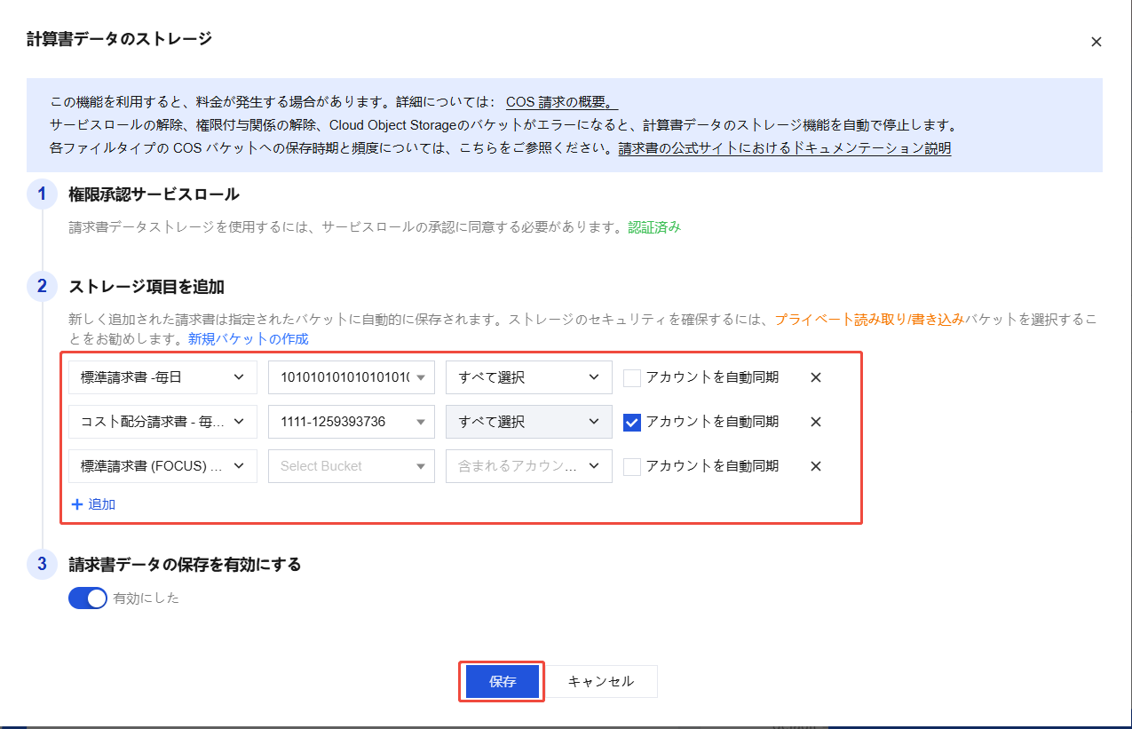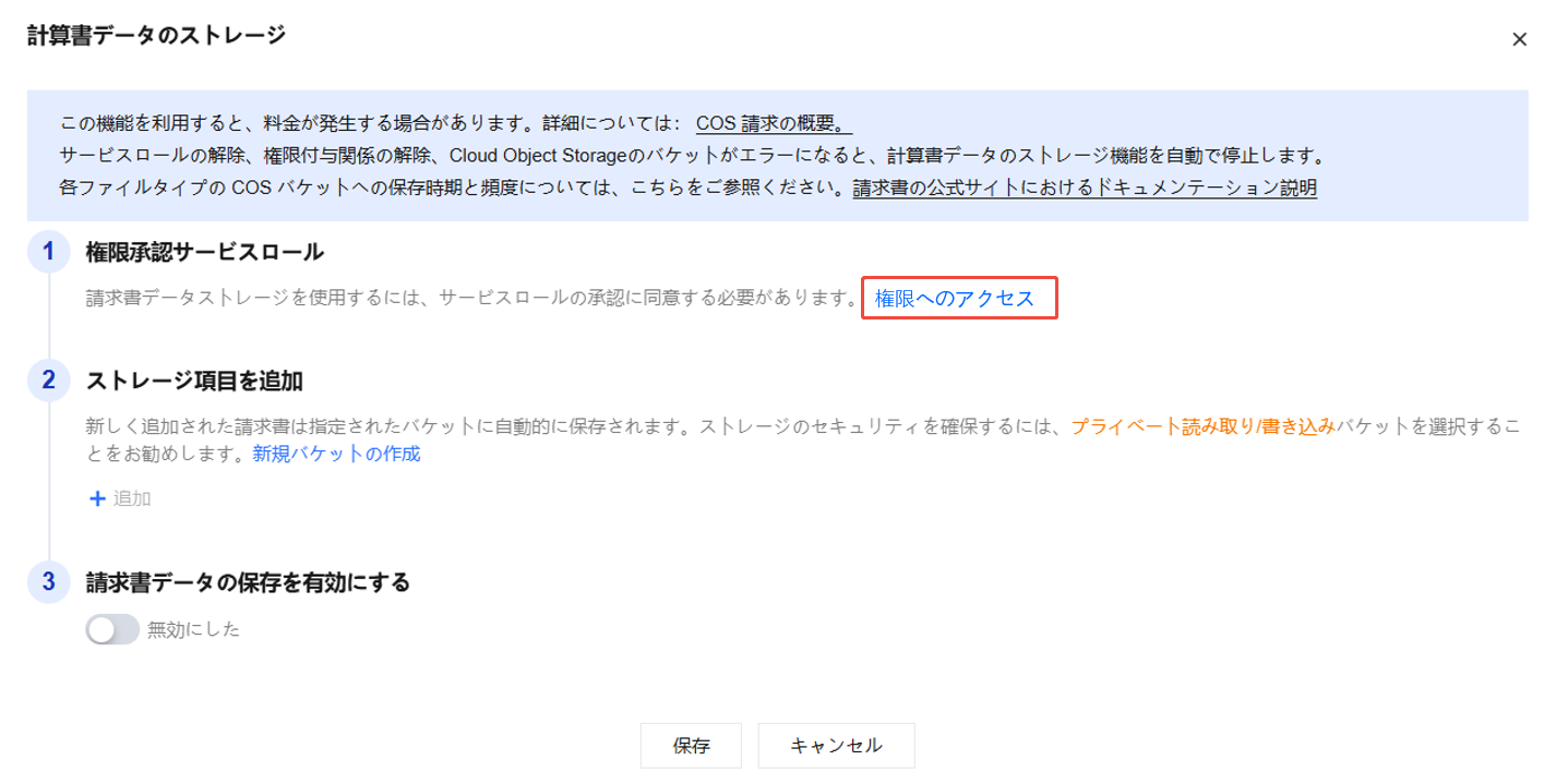 この機能は料金が発生する可能性があります。詳細については、COS 課金の概要をご参照ください。 COSへの請求書保存機能の有効化