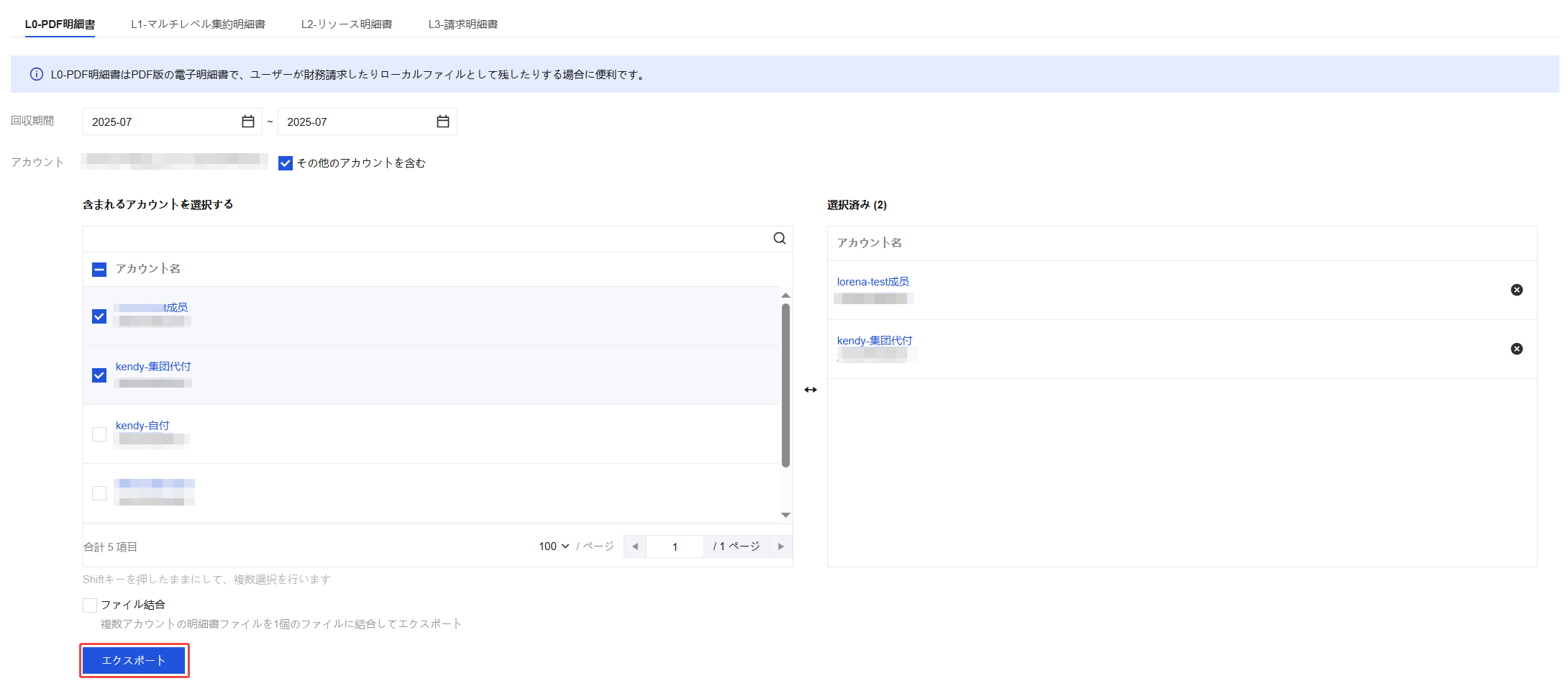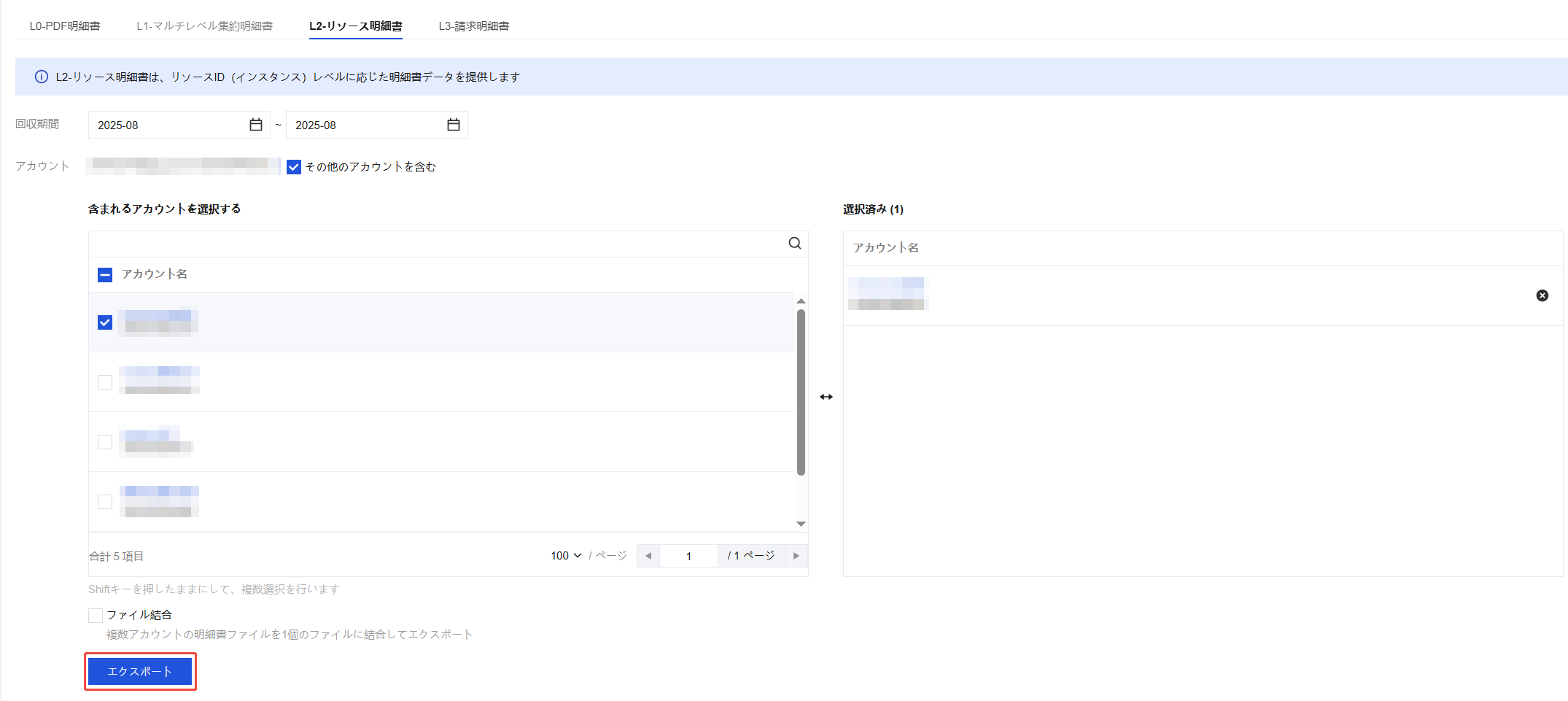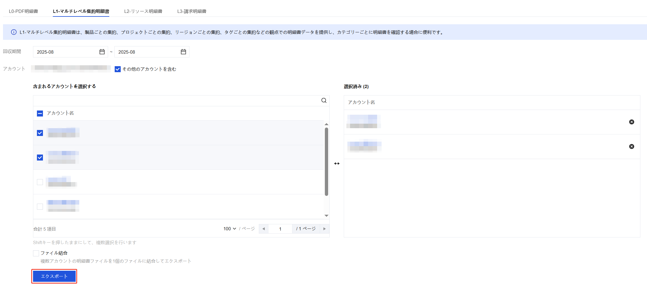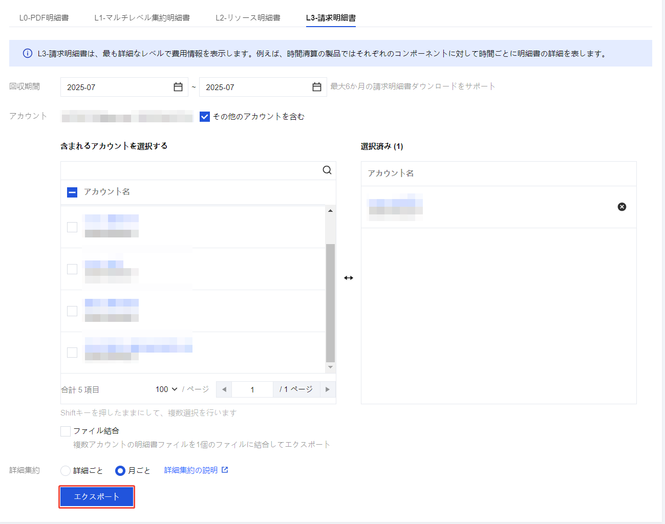 複数月のリソース請求書を一度にダウンロードすることができ、異なる月のデータは1つのファイルに結合されます。また、異なるアカウントのデータを結合するかどうかを選択できます。