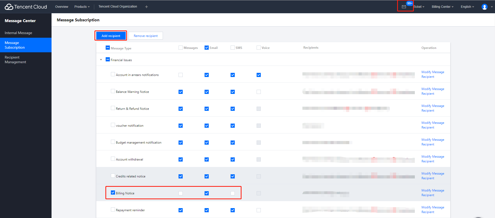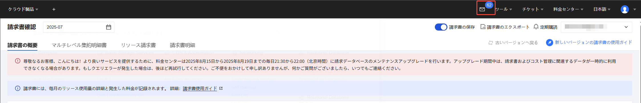 1. Tencent Cloudコンソールにログインし、右上の✉をクリックします。