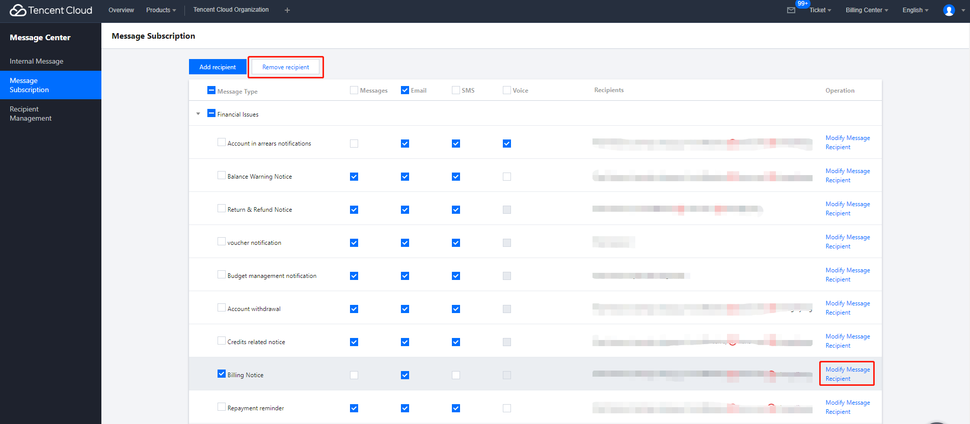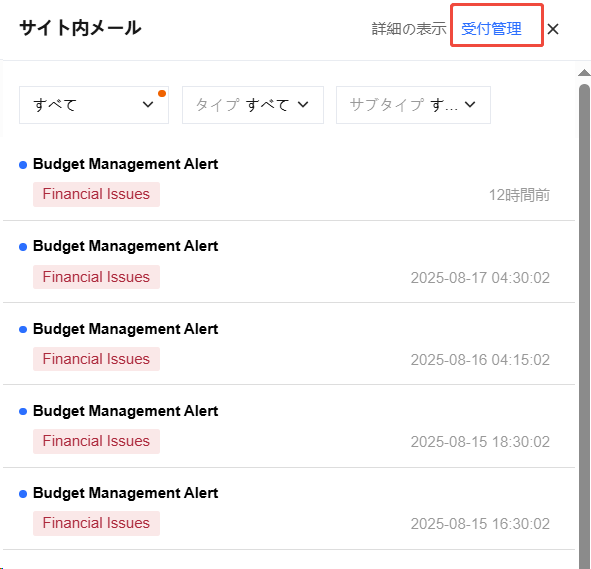 3. メッセージサブスクリプションページで請求書発行通知を見つけて選択し、受信するメッセージタイプ(サイト内メッセージ、メール、Short Message Service (SMS))にチェックを入れます。