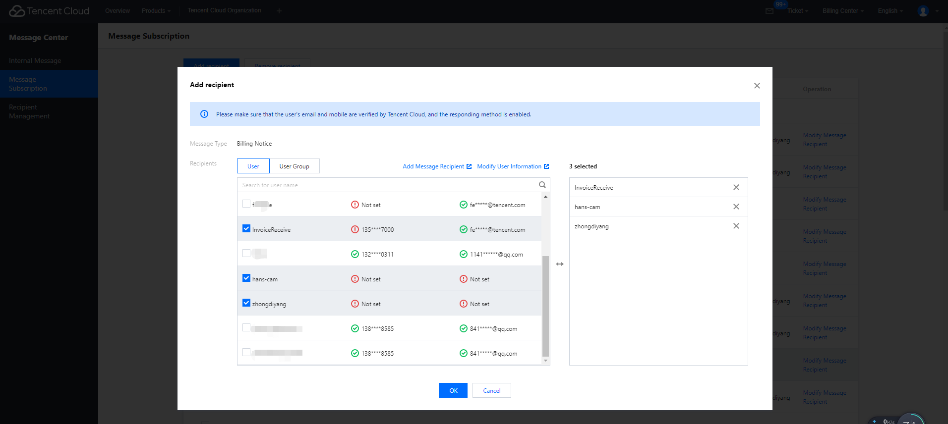 お客様の請求料金データの安全性を保証するため、請求通知の受信者変更はセンシティブな操作であり、認証が必要です。ユーザーまたはユーザーグループ情報を追加または変更する場合は、ユーザーと権限に移動できます。