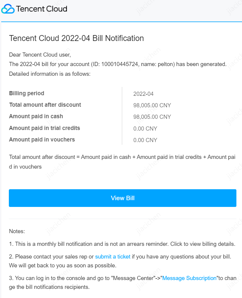 システムは毎月の請求書発行完了後、自動的に請求書受取人に請求書通知を送信します。通知内容は前月の請求書の料金概要であり、お客様に照合を適時に行い、Tencent Cloudでの消費状況を把握するようお知らせします。