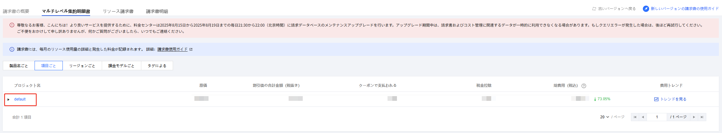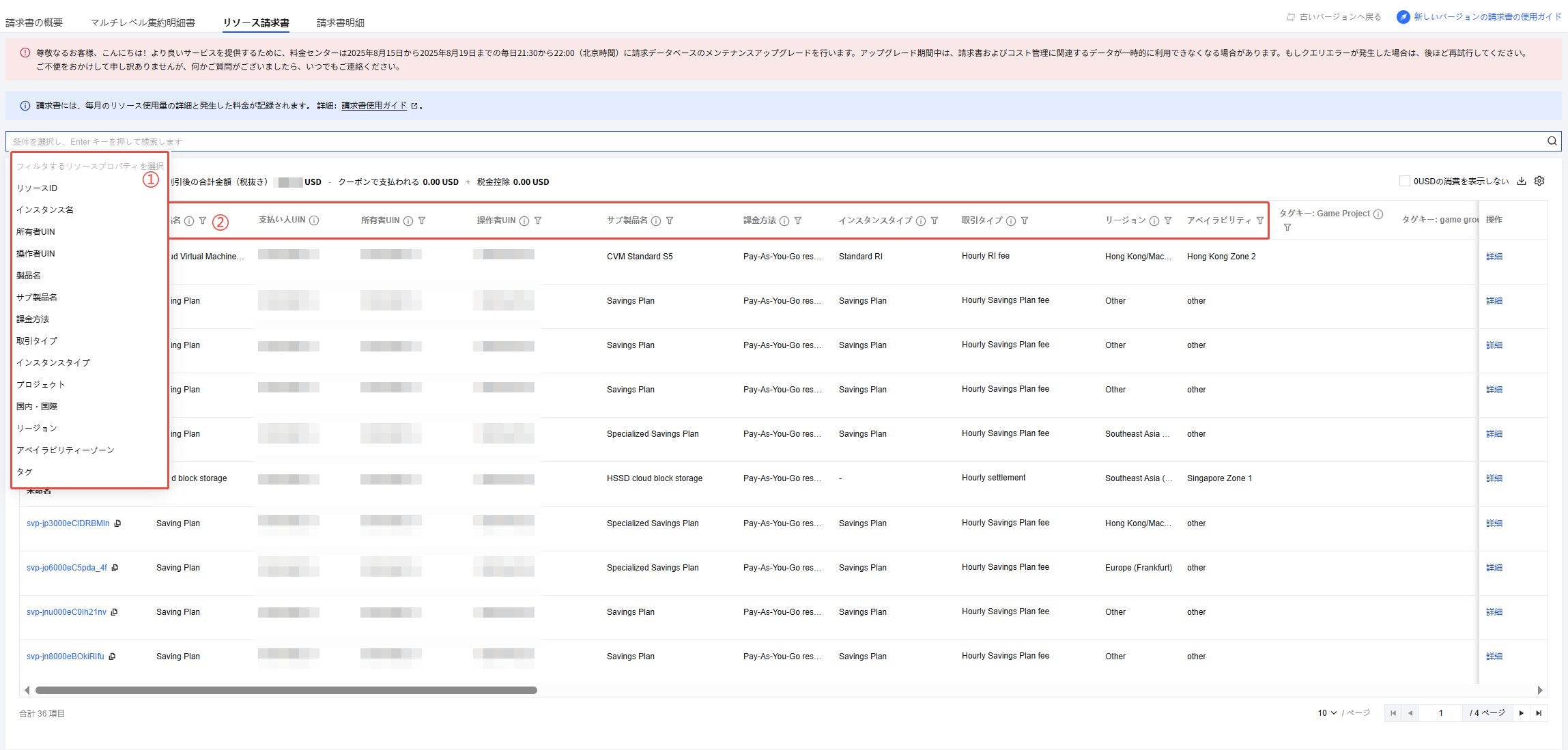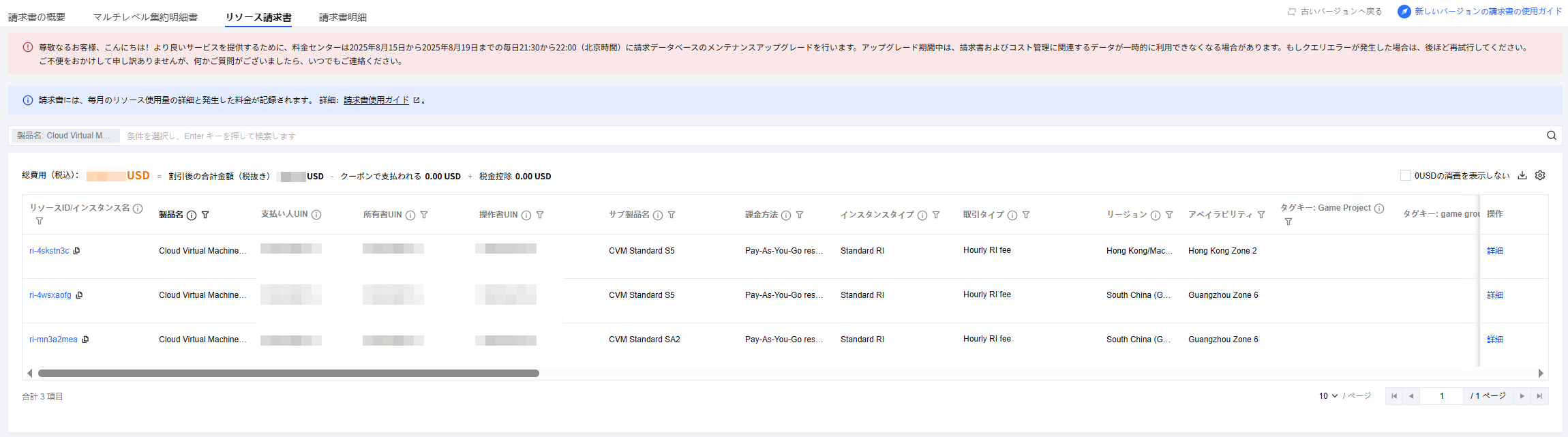 リソースの請求書データはT+1で発行され、リアルタイムデータではありません。リアルタイムデータについては、請求明細書をご確認ください。 リソースの請求書ページの検索結果の並べ替えルール:割引後総額の降順です。割引後総額が同じ場合は、リソースidの降順となります。
