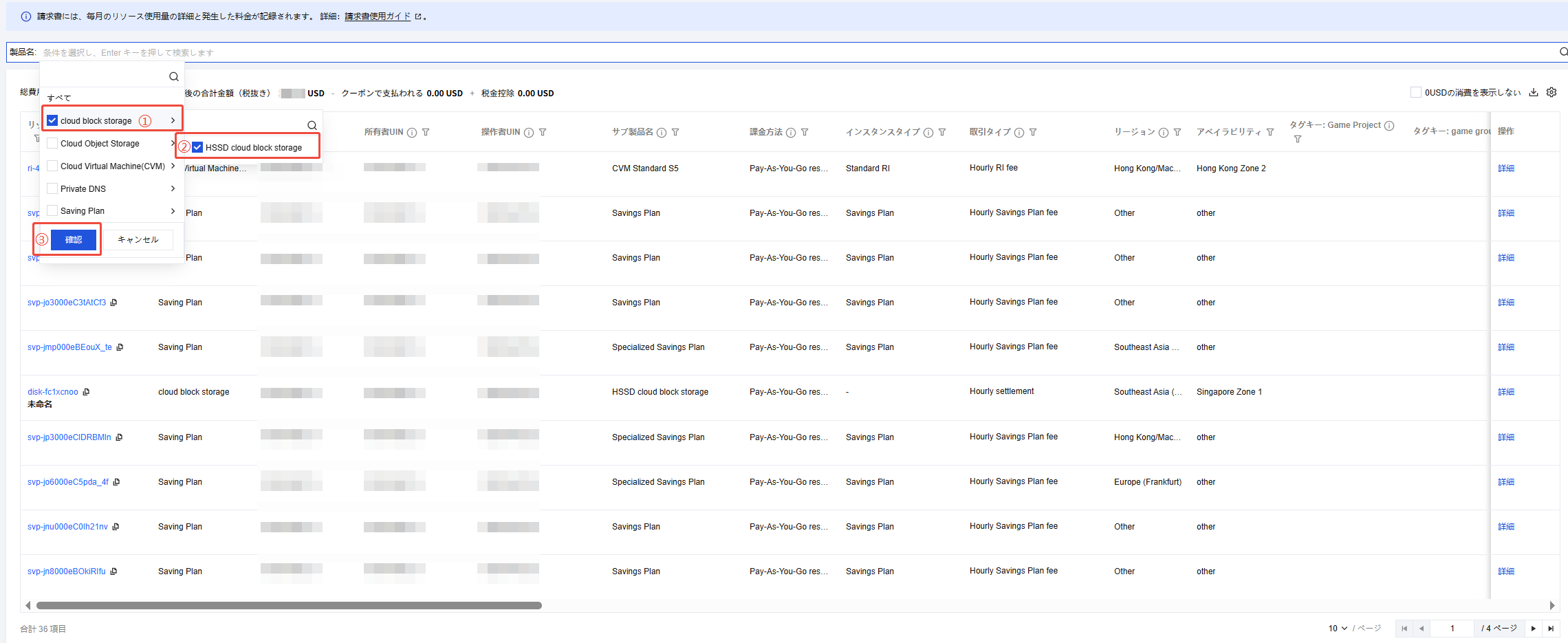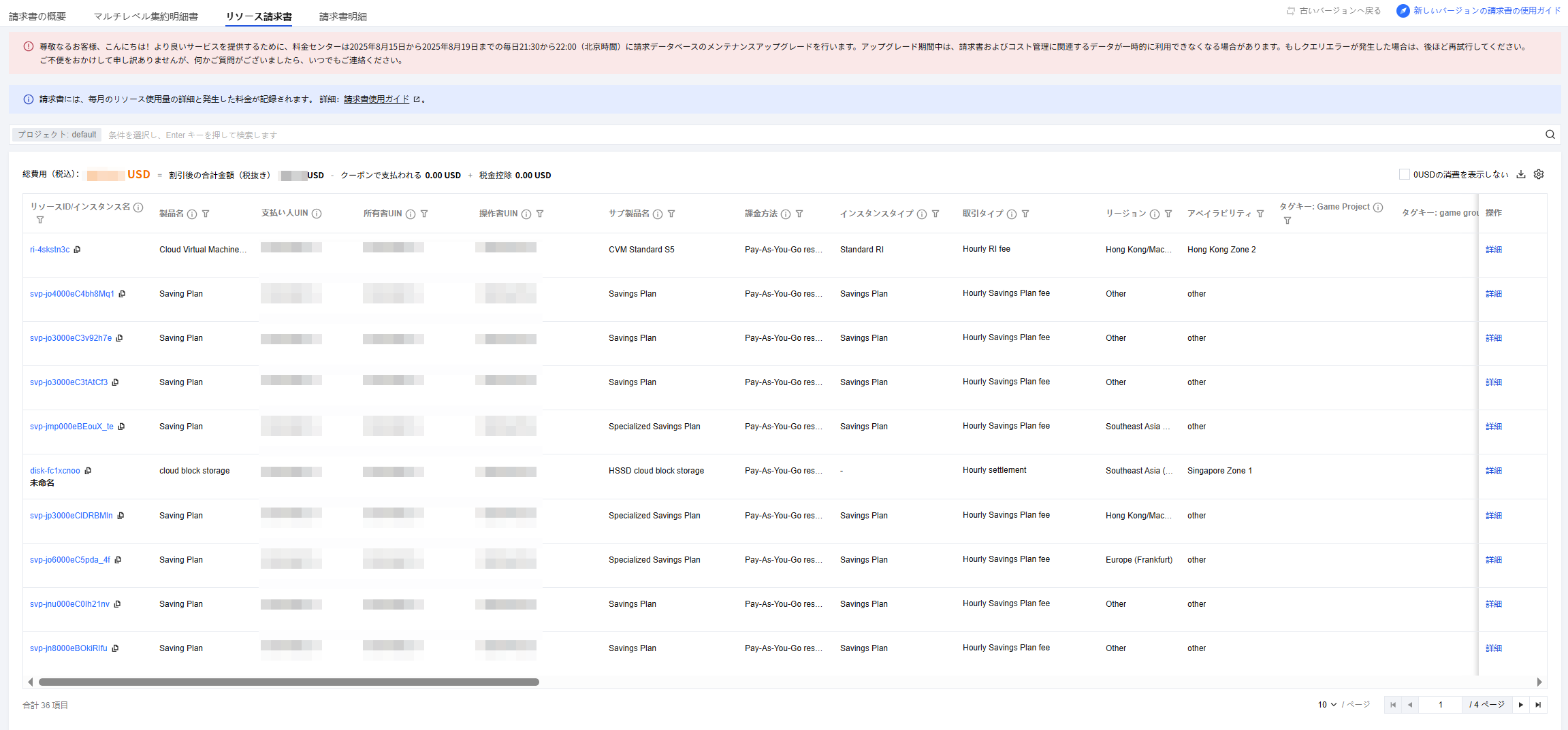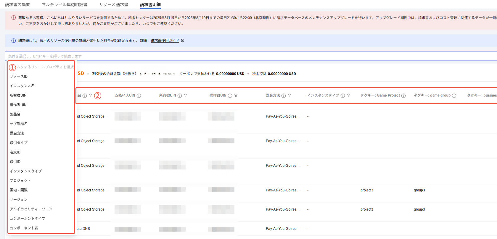 リソースの請求書データはT+1で発行され、リアルタイムデータではありません。リアルタイムデータについては、請求明細書をご確認ください。 リソースの請求書ページの検索結果の並べ替えルール:割引後総額の降順です。割引後総額が同じ場合は、リソースidの降順となります。