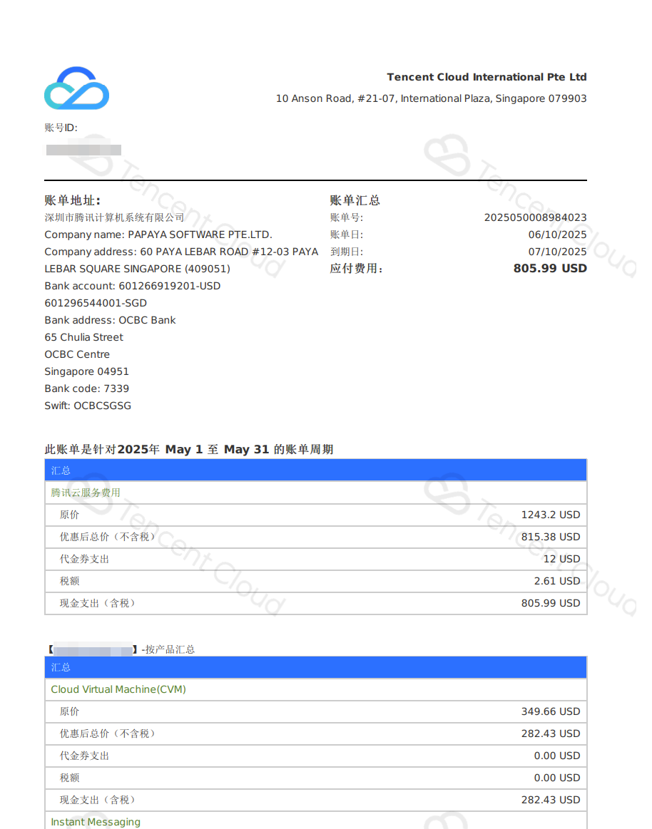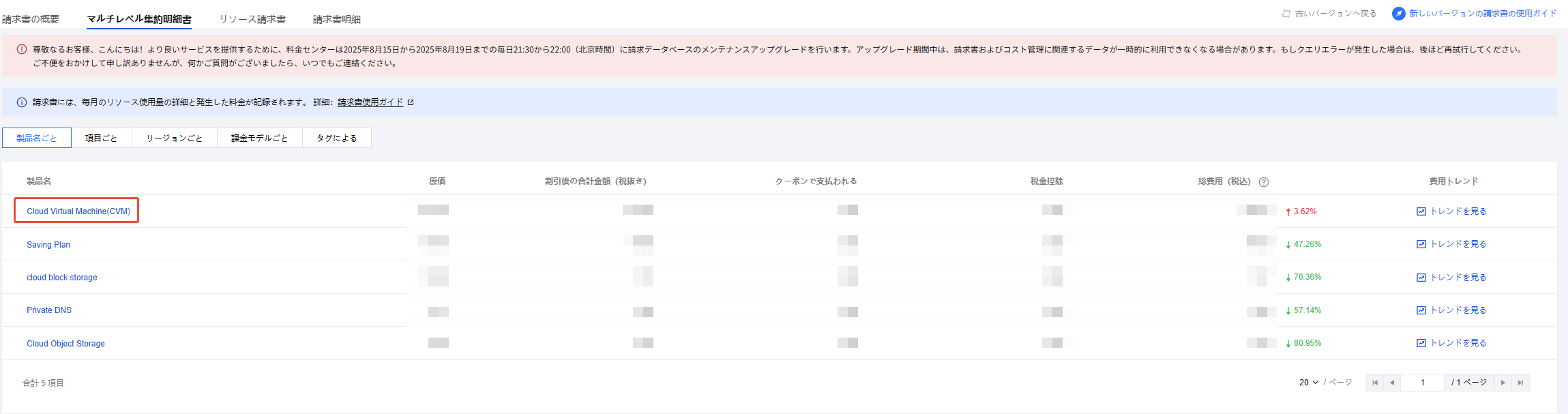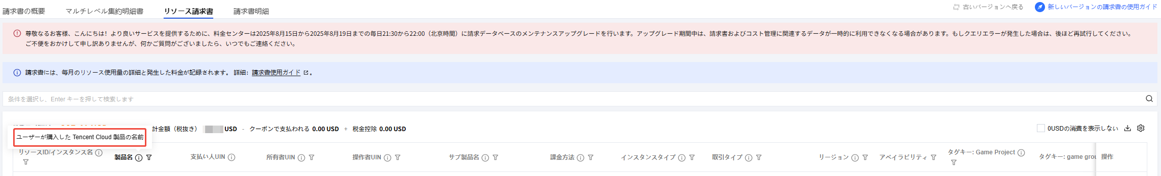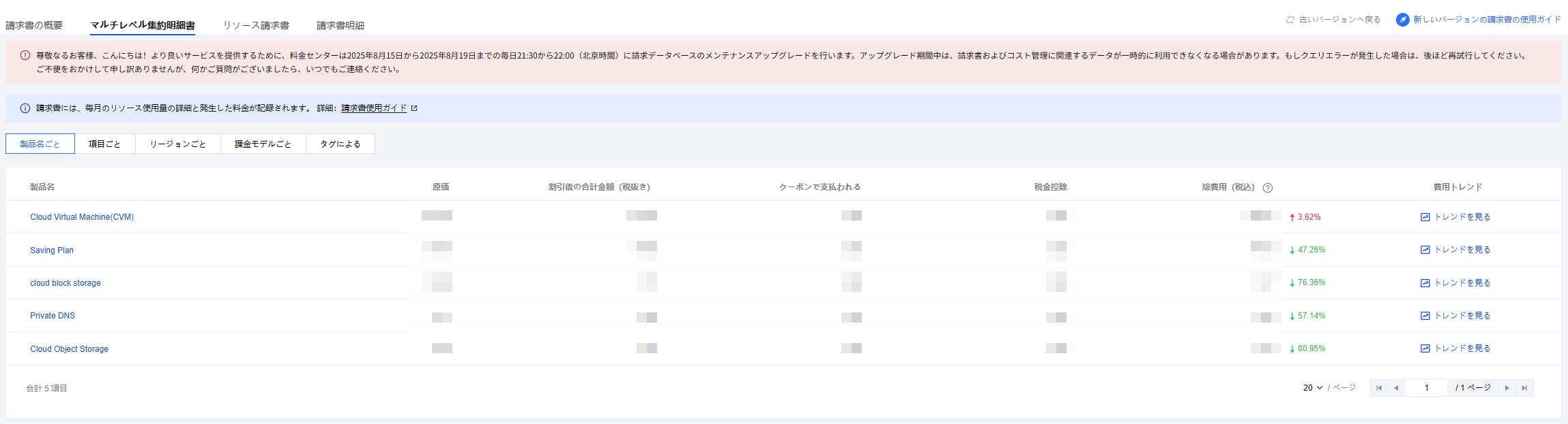 料金請求書は、ユーザーの毎月のTencent Cloudでの消費金額とリソース詳細を示し、以下の四つのレベルに分かれています。