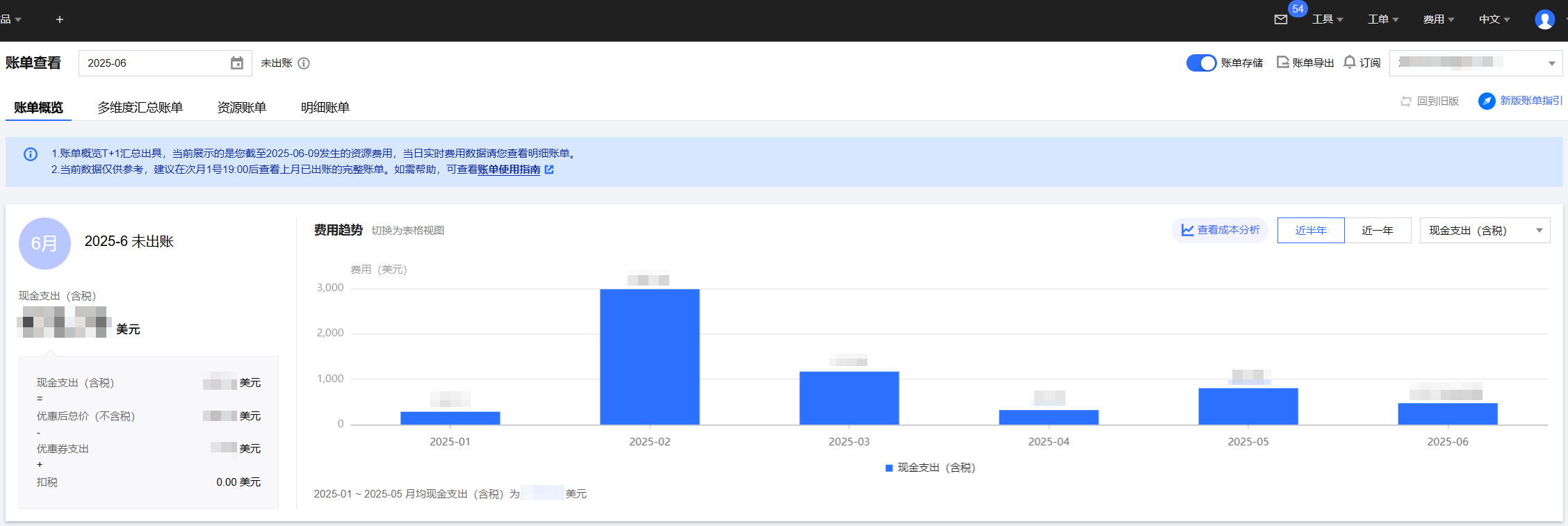 請求書概要データはT+1で発行され、リアルタイムデータではありません。リアルタイムデータについては、請求明細書をご確認ください。 お客様は概要ビューを通じて、月間請求書の総料金構成、月間請求書の料金トレンドグラフ、および各種ディメンションの請求書料金構成の概要を把握できます。