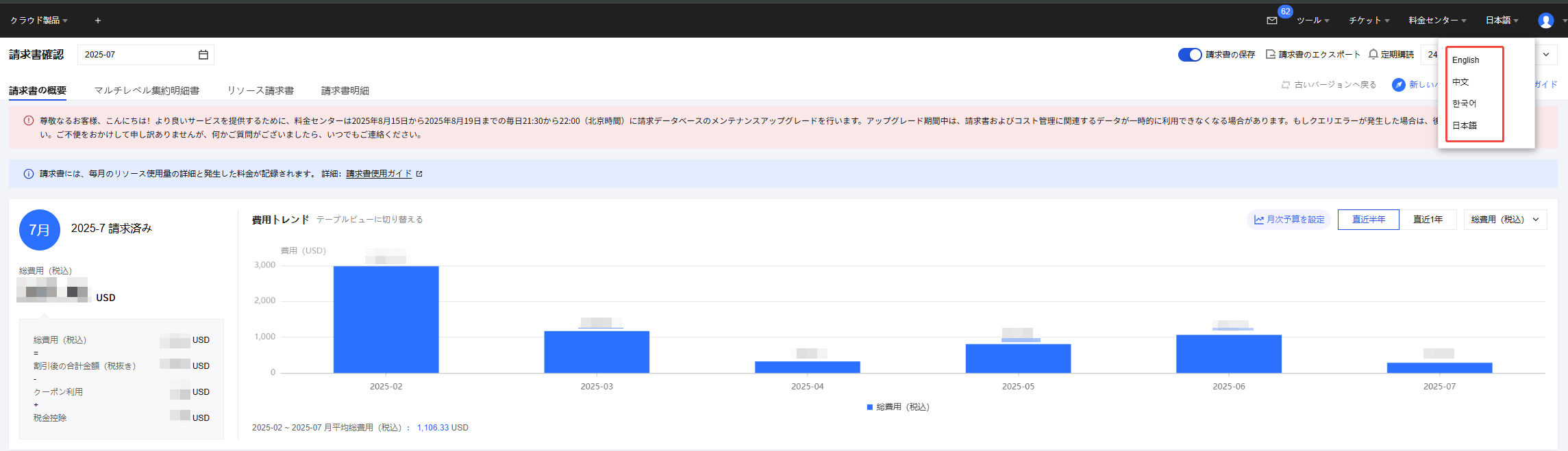 請求明細書データはリアルタイムデータですが、課金時間と比較して約20分の遅延があります。前月の確定済みの完全な請求書については、翌月1日19:00以降にご確認されることをお勧めします。