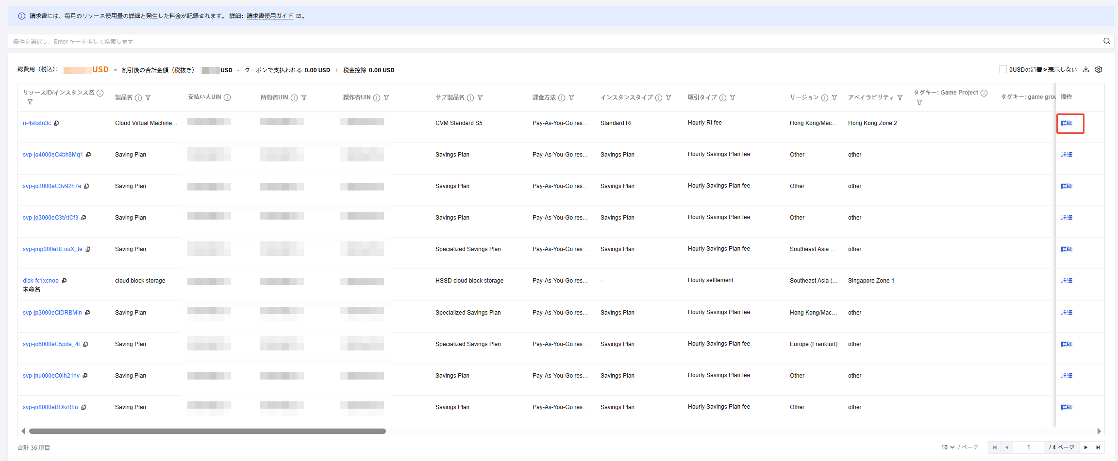 Tagリストページに移動してTagを作成し、各クラウドリソースのコンソールでリソースに対応するTag値を割り当てます。 コスト配分Tagページに移動して、請求書に適用したいタグキーをコスト配分Tagとして設定します。Tagのその他の機能説明については、コスト配分Tagを参照してください。 製品名をクリックするとリソースの請求書ページにジャンプし、当該製品のリソース請求書料金詳細を確認できます。プロジェクト、地域、課金モード、Tagもすべてこの操作をサポートしています。 製品のリソースの請求書料金詳細は、下図の通りです。