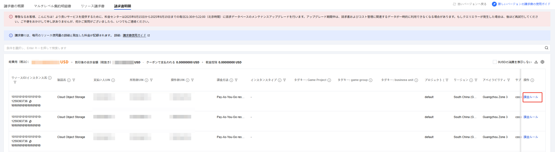 課金ルール:各課金レコードの操作列にある課金ルールをクリックすると、製品の定価ページにジャンプでき、当該製品の課金ルールを迅速に把握できます。