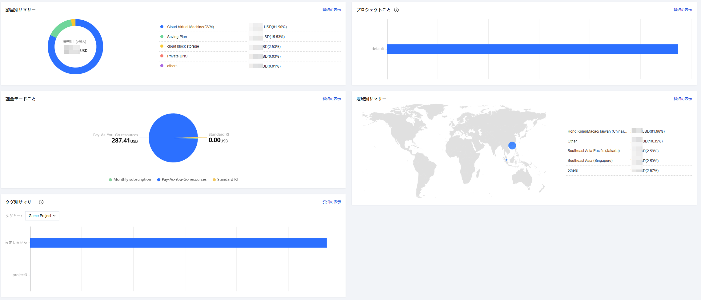 プロジェクト別サマリー:プロジェクト名に基づいて料金を集計します。プロジェクト管理ページに移動してプロジェクトグループを作成し、各クラウドリソースのコンソールホームページでリソースを対応するプロジェクトグループに割り当ててください。 地域別サマリー:地域に基づいて料金を集計します。