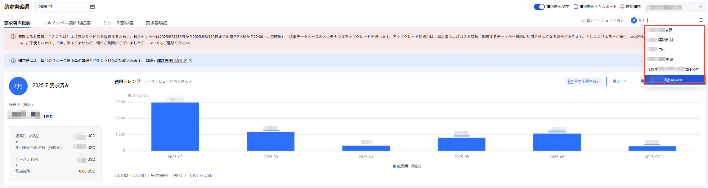グループアカウントのメンバーアカウント請求書表示:お客様はページ右上隅で必要に応じてグループメンバーアカウントへの切り替えを選択でき、メンバーアカウントの請求書料金を確認できます。