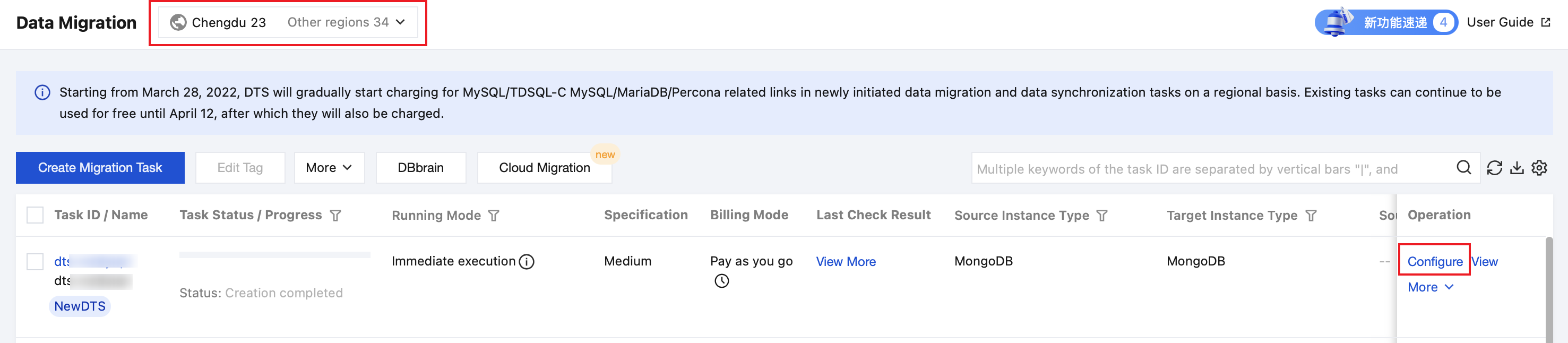 Creation Mode | New task: Create a task. Create a similar task: Quickly create a task with the same configuration as the historical task. The settings of the new task, such as the database type, access method, billing mode, and migration type, are pre-populated to match the historical task. Users can also modify these settings as needed. |