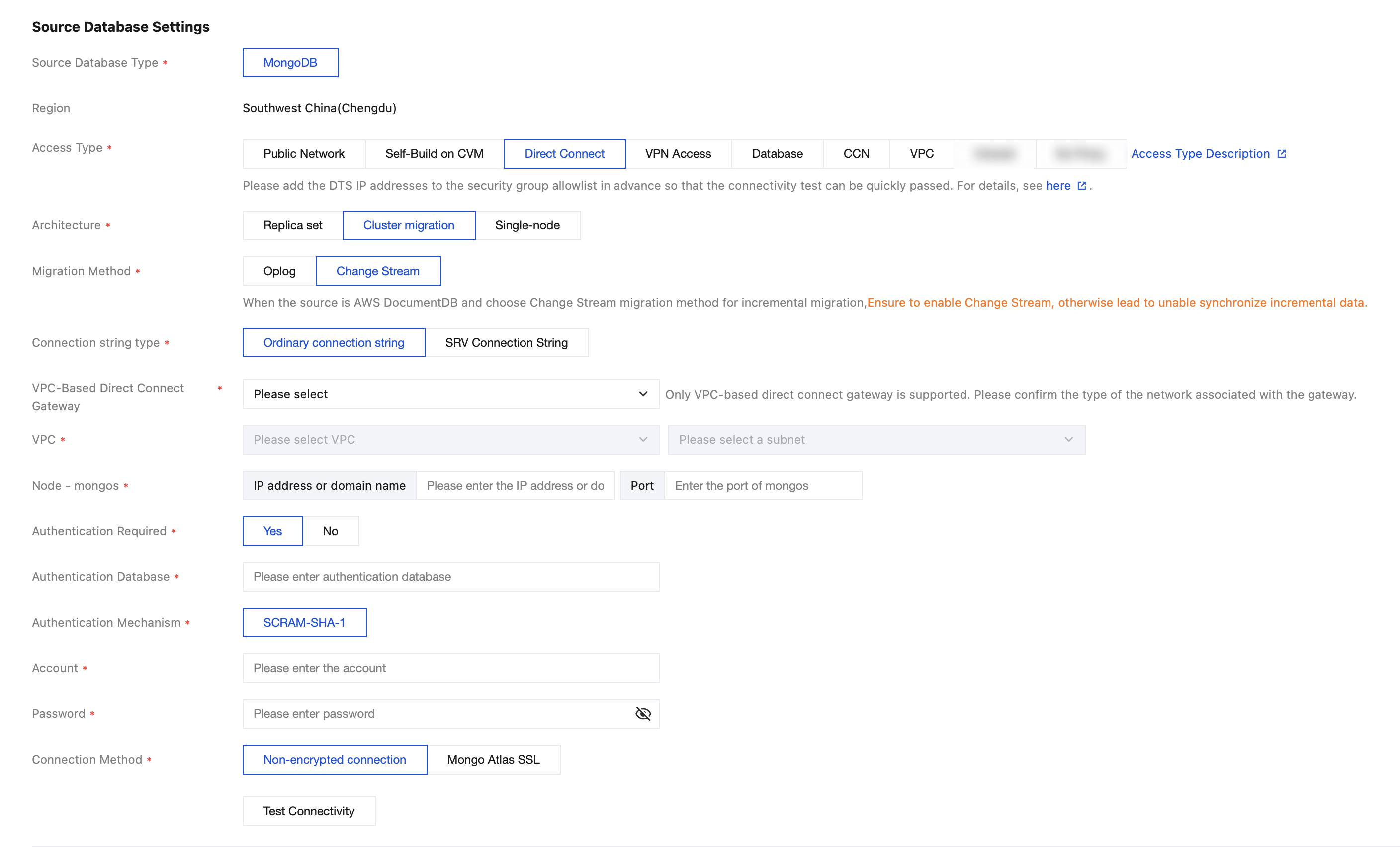 Architecture | This parameter is displayed when Access Type is set to Self-Built on CVM/DC/VPN Access/CCN/VPC. Select an access type according to the actual situation. Replica set: refers to an architecture in which the source database is a replica set, composed of one primary node and one or more secondary nodes. Cluster migration: refers to an architecture in which the source database is a sharded cluster, composed of components such as mongos nodes, config servers, and shard nodes. Single node: refers to an architecture in which the source database cluster is a single node that performs read and write operations. Note: After an architecture type is selected and the connectivity test is passed, changing to a different architecture type is not allowed; otherwise, an error is reported for the task. |