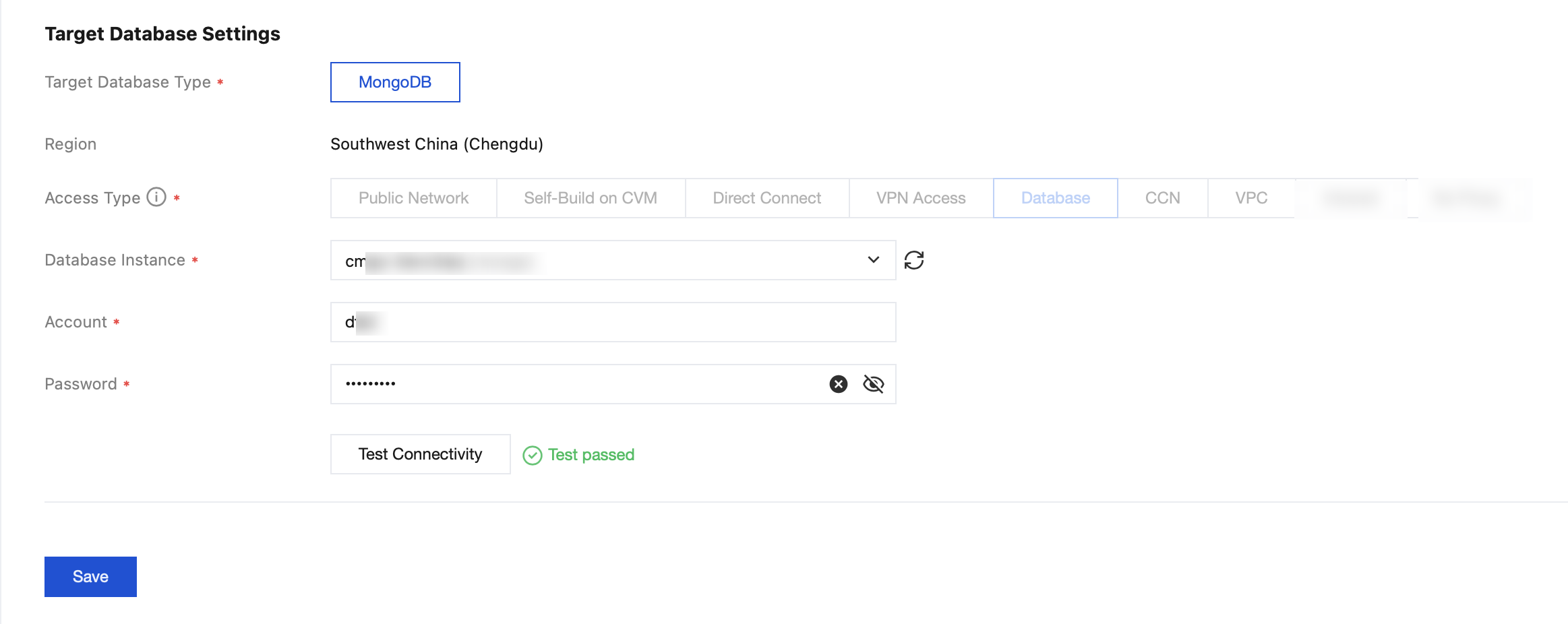 Access Type | Select the access type based on your scenario. The configuration principles for different access types are similar to those of the source database. Note: Migration off the cloud is supported. When the source database access type is set to Cloud Database, the access type of the target database can be set to Public Network/Self-Built on CVM/DC/VPN Access/CCN. |