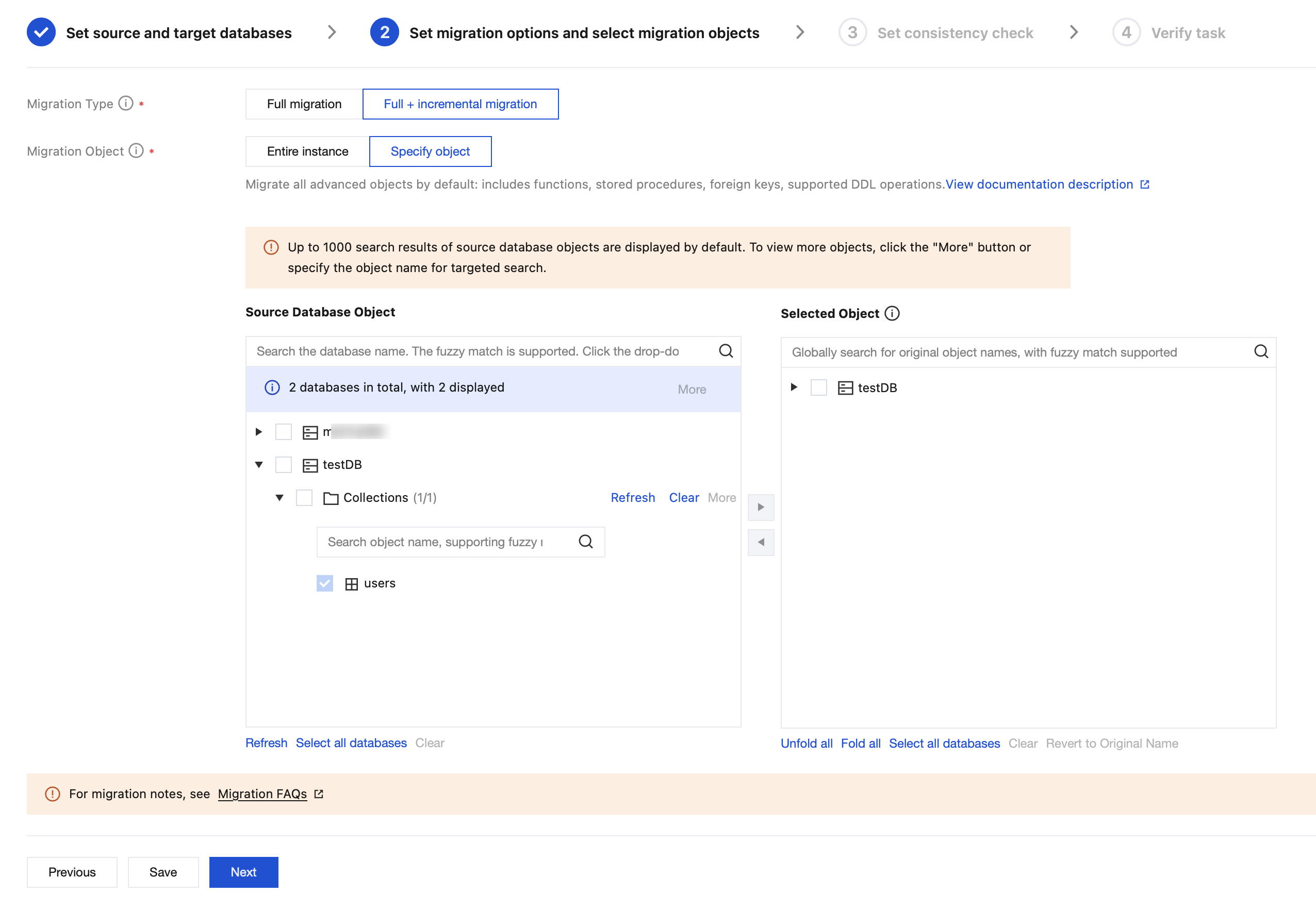 Migration Object | Entire instance: Migrate the entire instance, excluding system databases admin, local, and config. Specified objects: Migrate specified objects. |