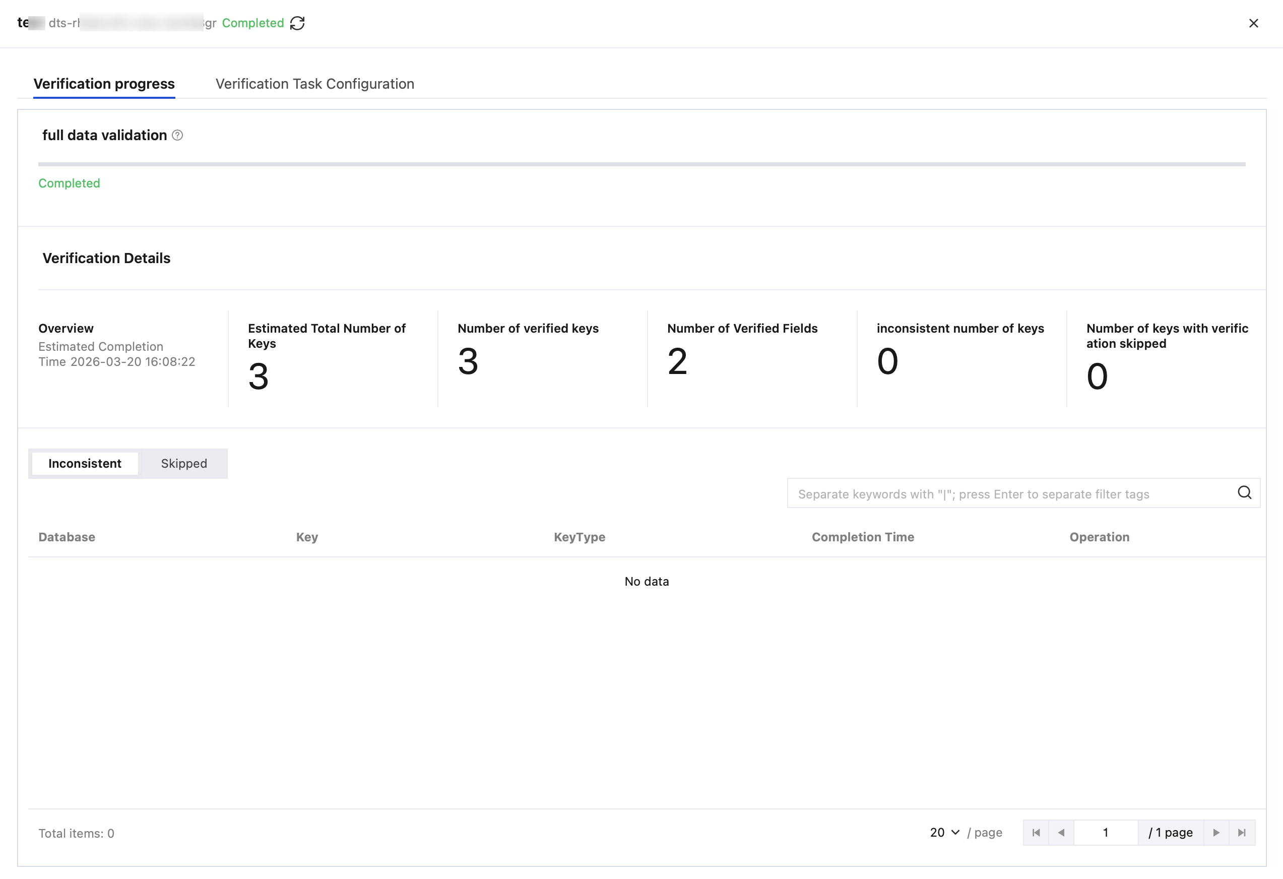 3. View the estimated total number of keys, the number of checked keys, the number of checked fields, the number of inconsistent keys, and the number of skipped keys.