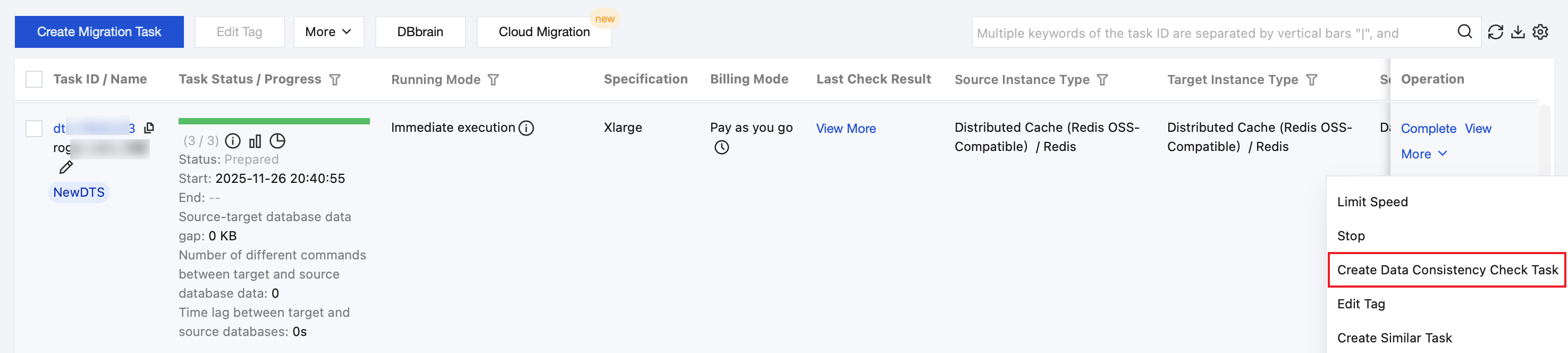 2. On the Data Migration page, select the migration task to be checked, and choose More > Create Data Consistency Check Task in the Operation column.