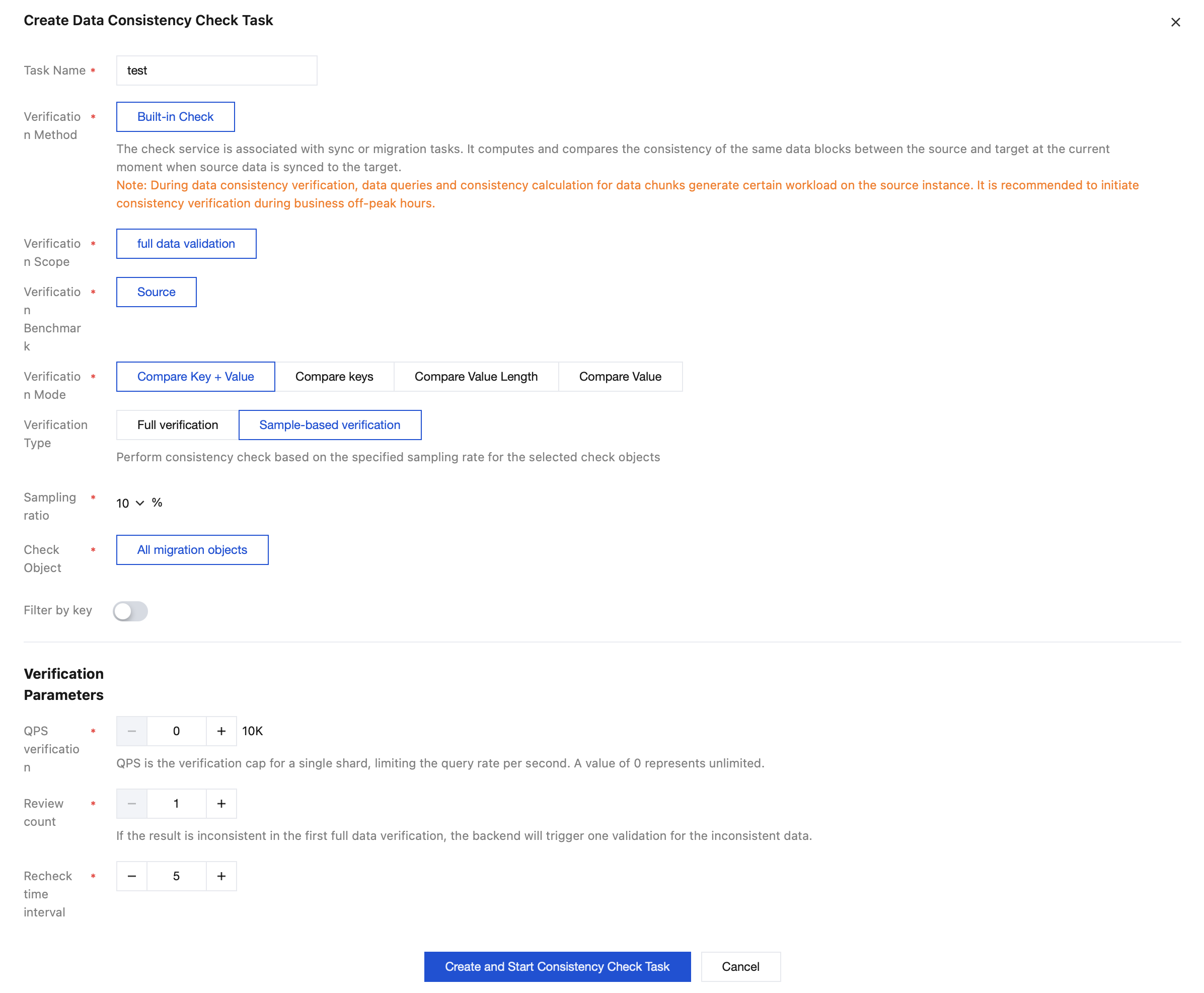 Sampling ratio | Configure the sampling ratio for keys, which can be 10%, 20%, 30%, 40%, 50%, 60%, 70%, 80%, or 90%. Note: This parameter needs to be configured only when Verification Type is set to Sampling Check. |