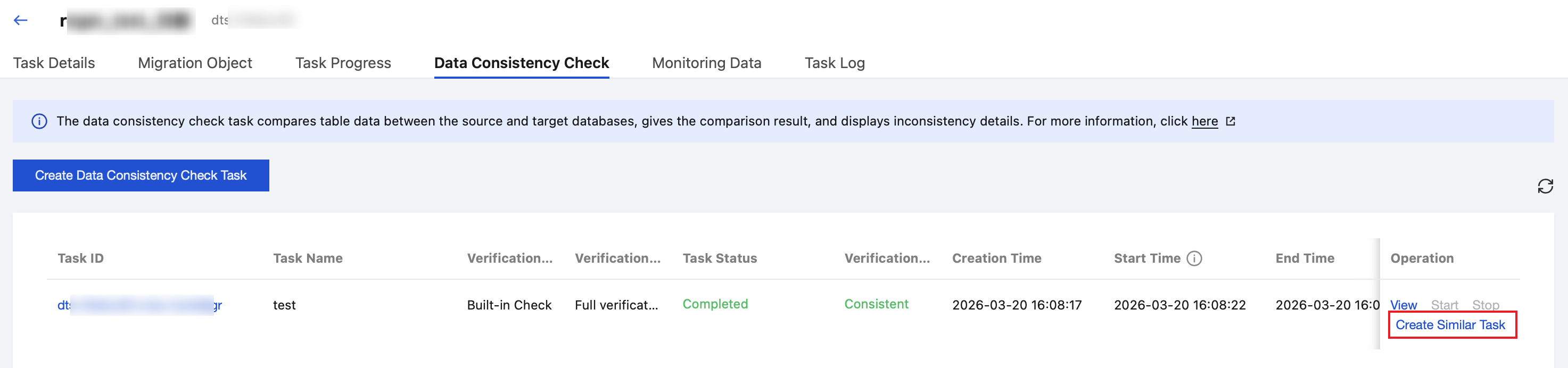 If a consistency check task already exists, you can click Create Similar Task in the Operation column and configure the related parameters.