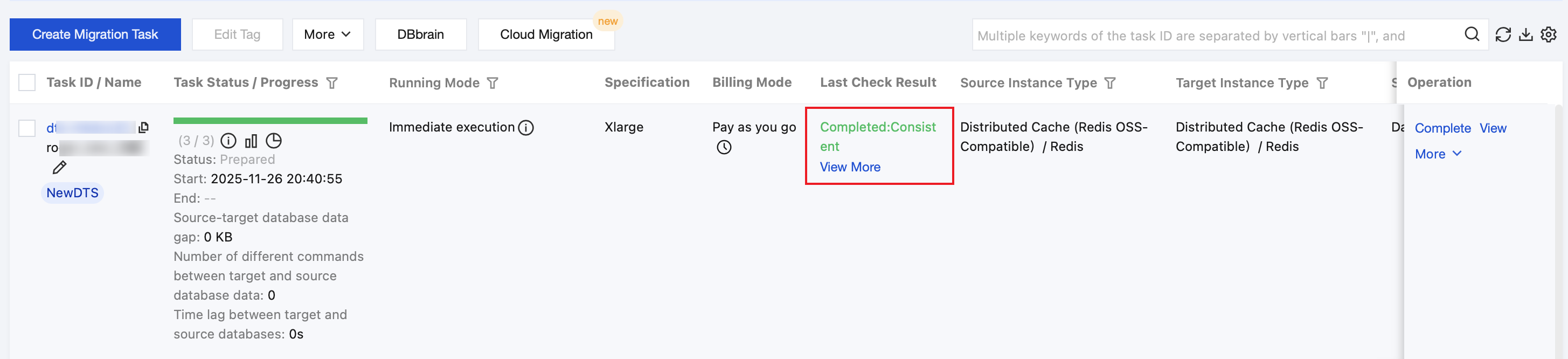 1. On the migration task homepage, view the check result (consistent or inconsistent) in the Last Check Result column, and click View More to go to the check details page.