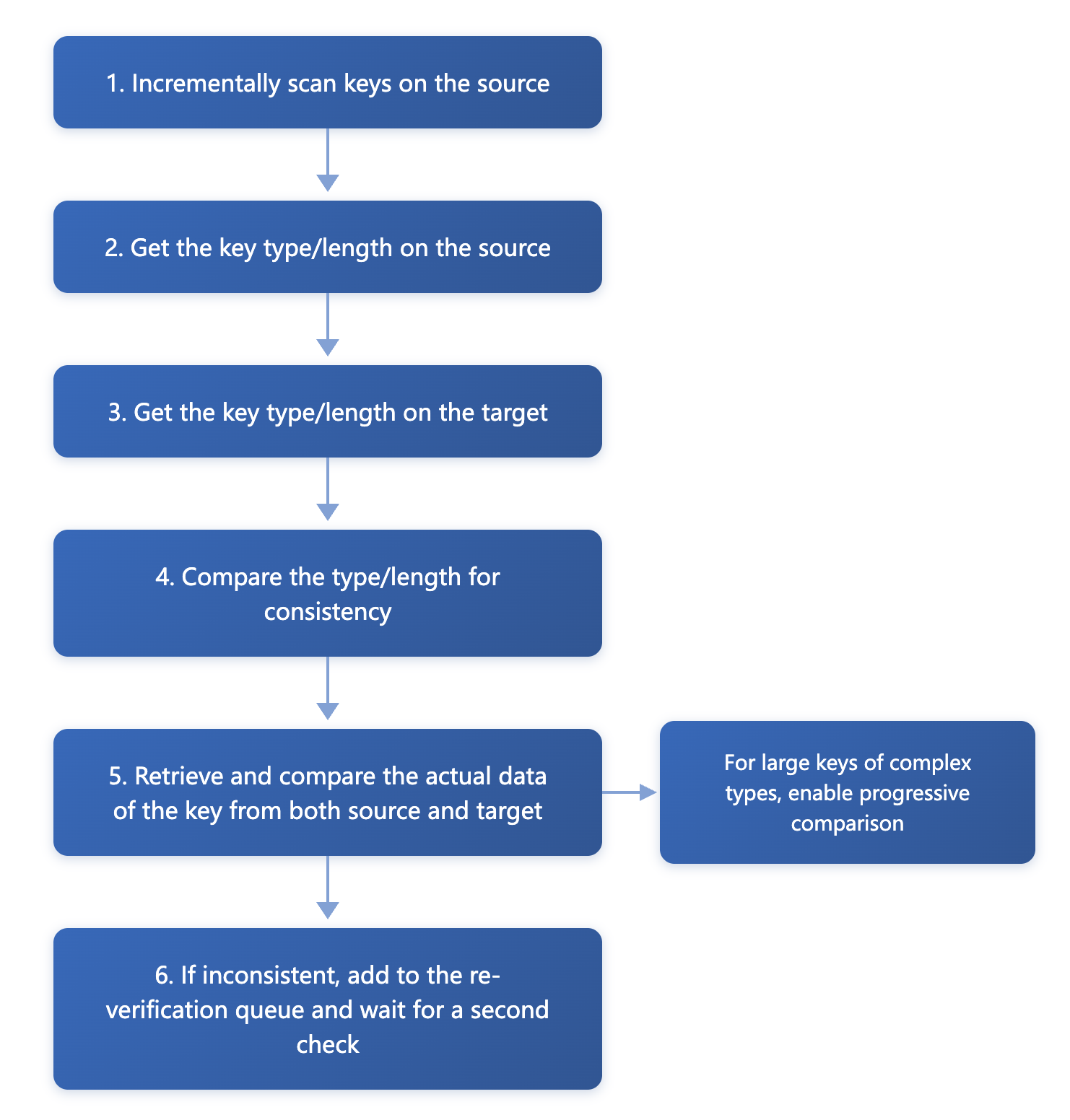 Verification Mode | Compare Key + Value: Checks whether all data is consistent. Compare Keys only: Only checks the existence of Keys. Compare Value length: Only checks whether the lengths of Values are the same. Compare Value: For Keys with a length exceeding 1000, only the length is compared, not the content. |