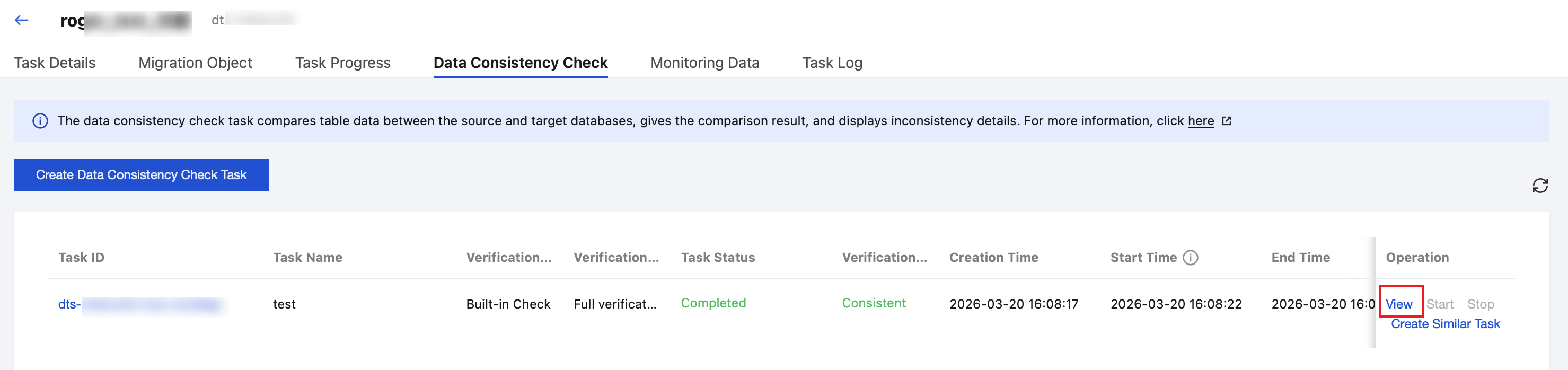 You can create a data consistency check task for an existing DTS migration task.