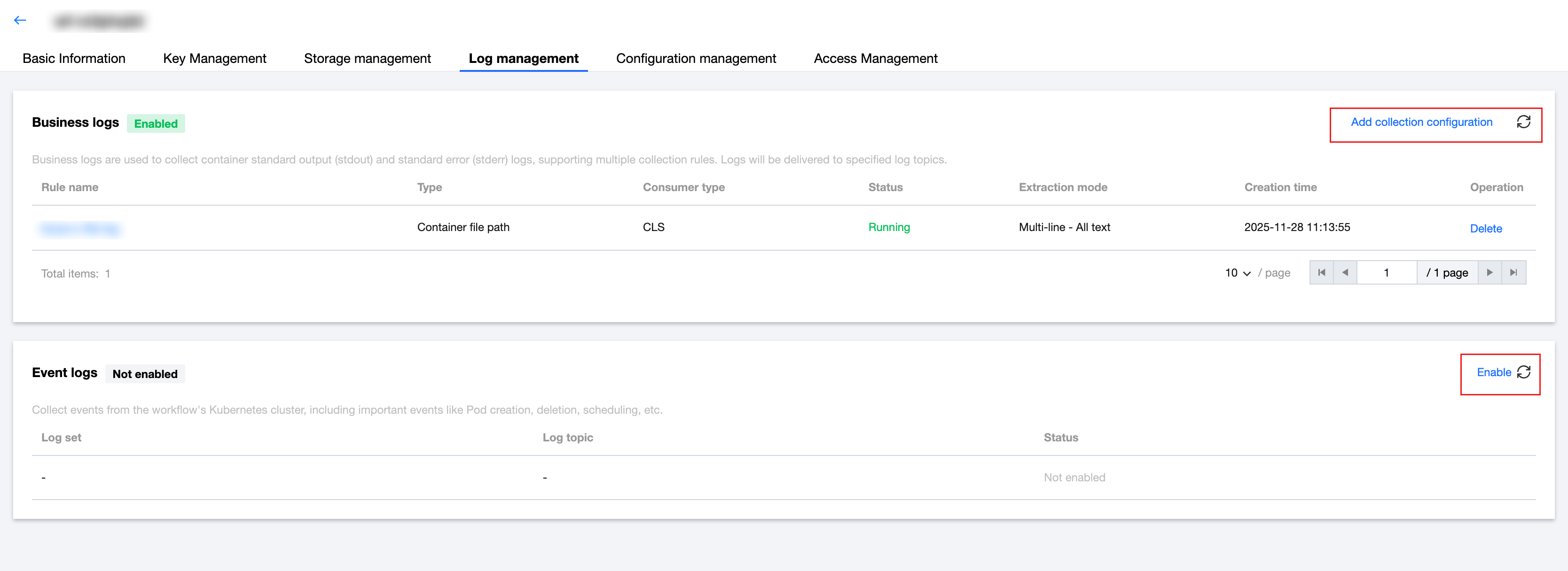 3. Select Log Management, and then choose to either add a business log collection configuration or enable event log collection, as shown in the following figure: