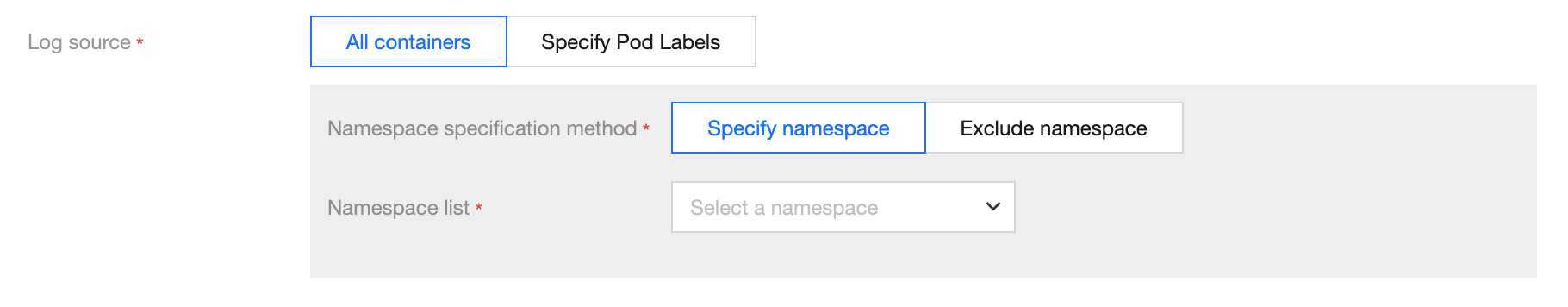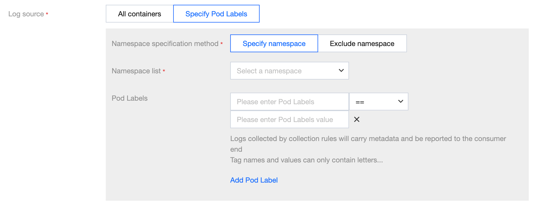 The log source supports All Containers and Specified Pod Labels, as shown in the following figure: