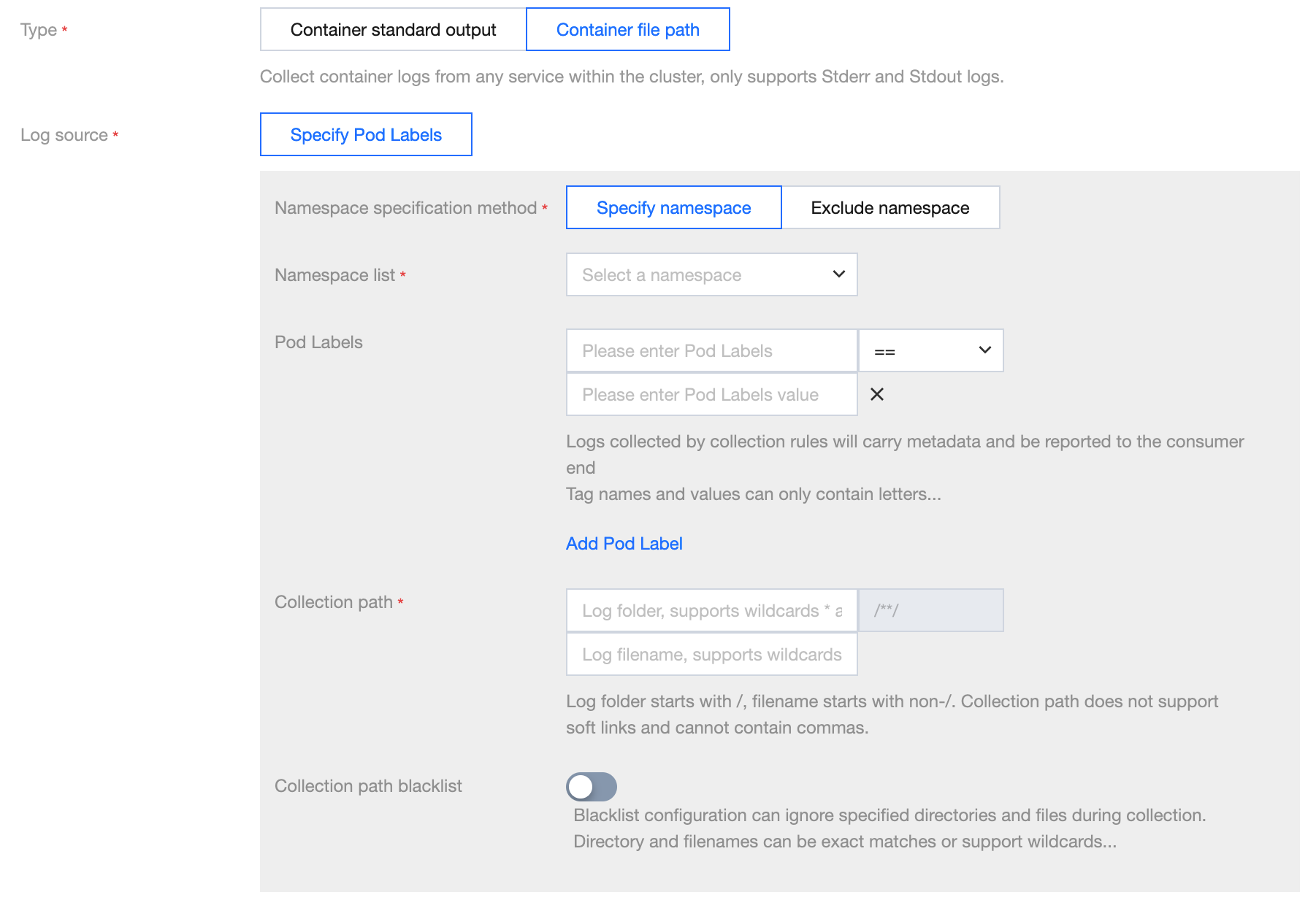 Pod Label: Add a Pod label to match. By default, all containers matching this label are collected.
