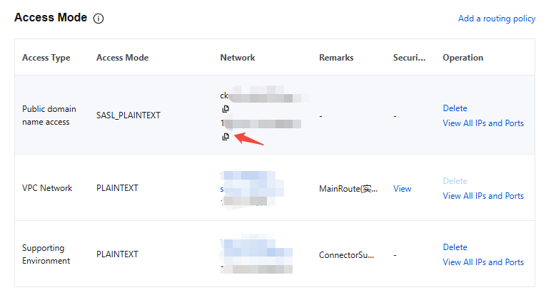 2. On the instance details page, select the Add a routing policy in the top-right corner of the Access Mode module to add a new public network route.